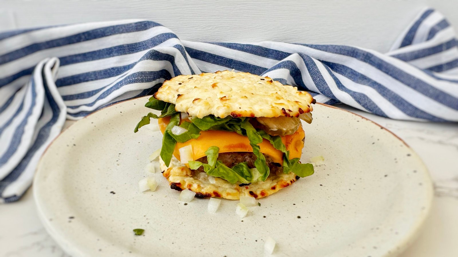 - Once the cheese wrap is cool enough to handle, assemble: cottage cheese base, beef patty, onions, lettuce, gherkins, and sauce.