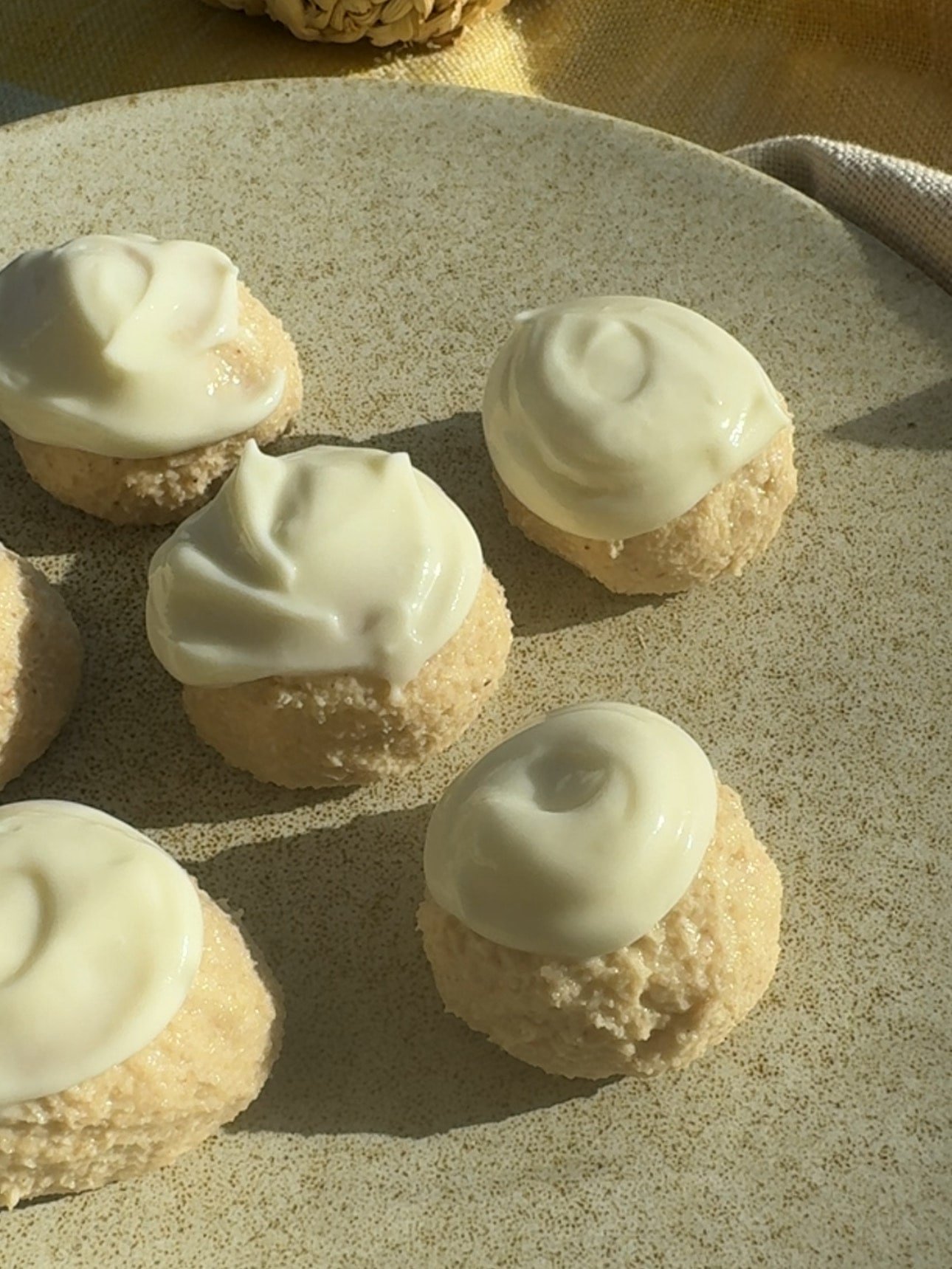 - Prepare icing – Beat cream cheese with powdered sweetener until smooth.