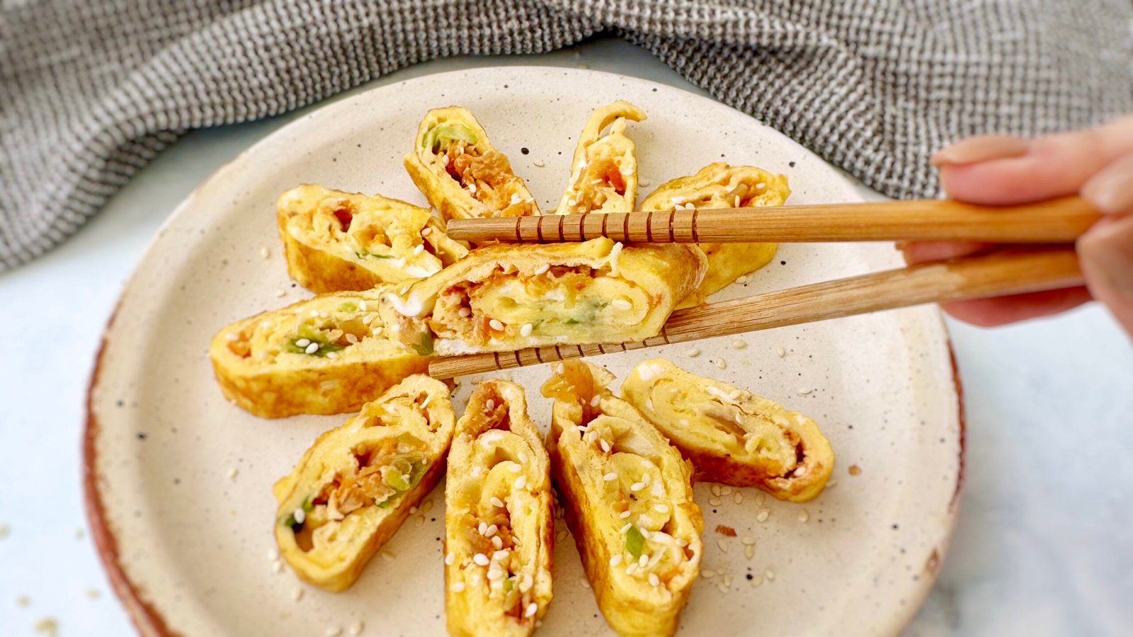 Tamagoyaki, a Japanese rolled omelette, is traditionally made with a lightly sweetened egg mixture cooked in thin layers. This version adds kimchi for a punch of flavour, spring onions for freshness, and cheese for extra richness. It’s an easy yet impressive dish that can be enjoyed on its own, with rice, or as part of a larger meal.