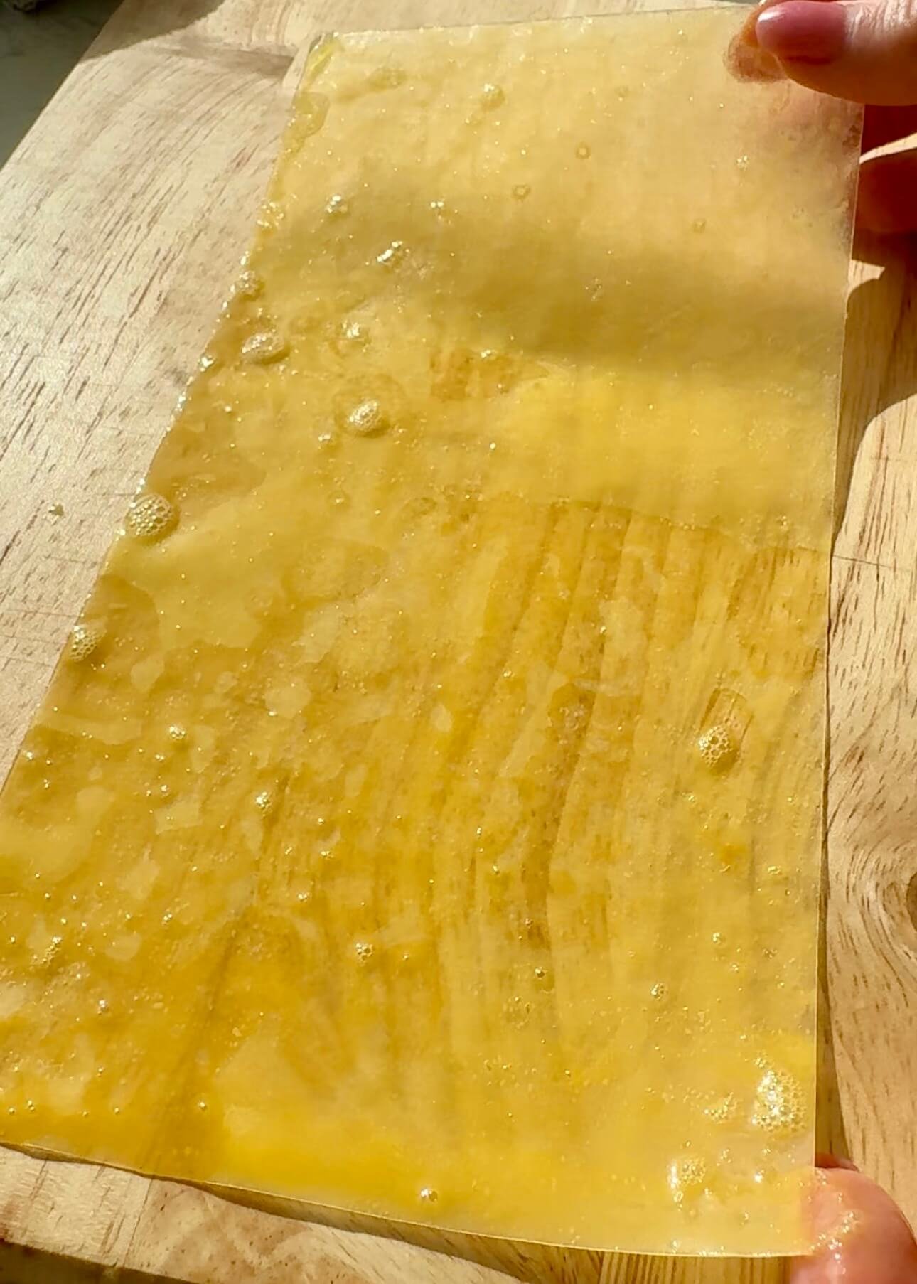 Cut rice paper sheets in half and briefly dip into the egg mixture. - Lay flat