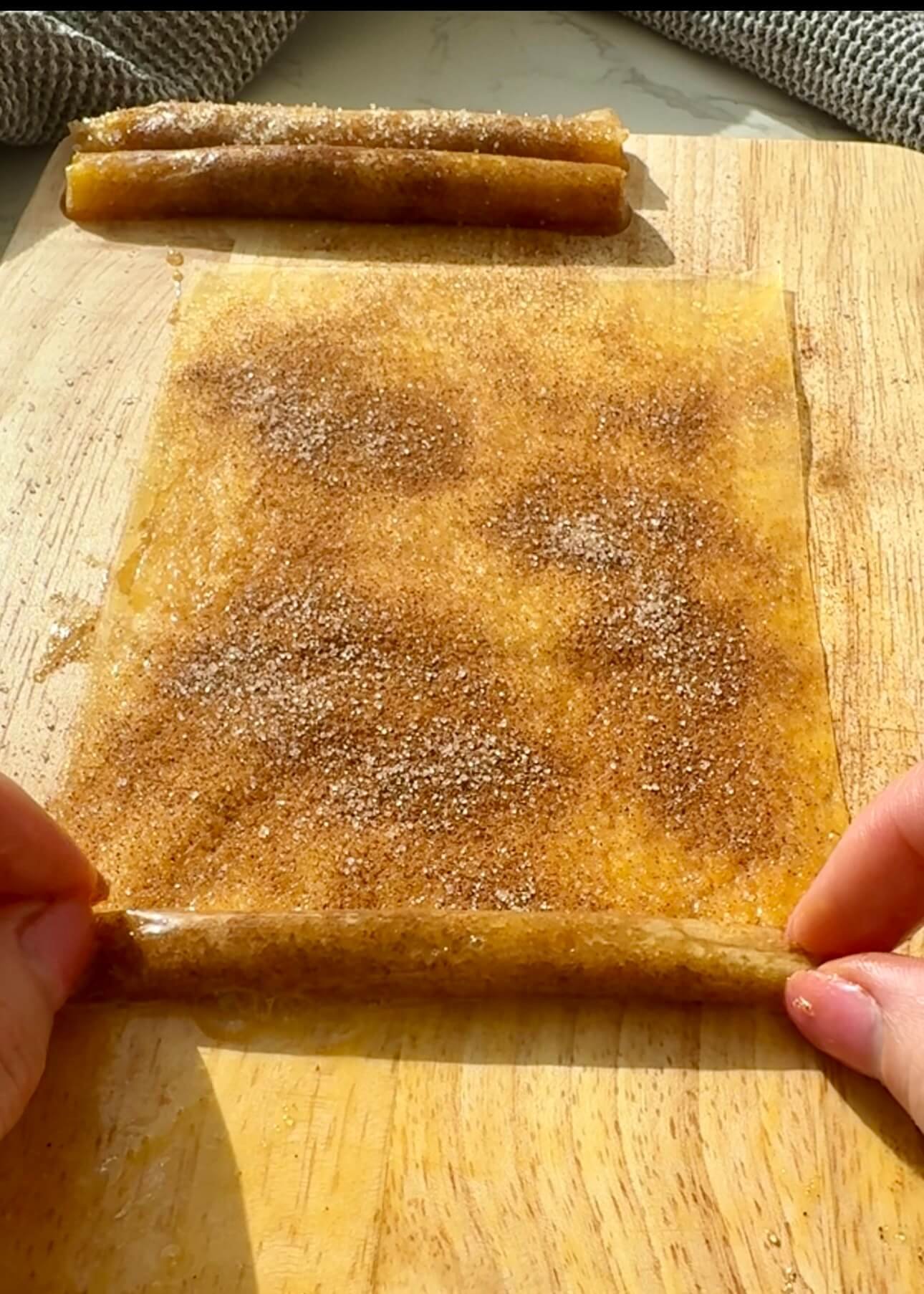 Mix erythritol and cinnamon together and sprinkle over the rice paper. - Roll tightly