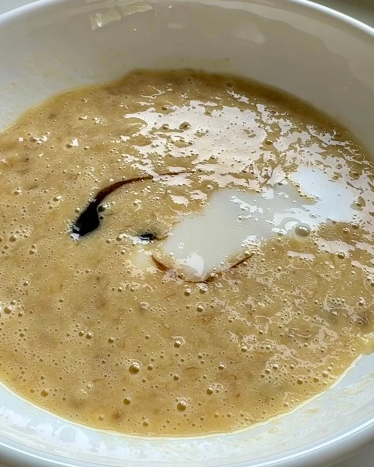 In a small bowl, mash your banana until smooth. Add the egg, vanilla, maple syrup, and almond milk.