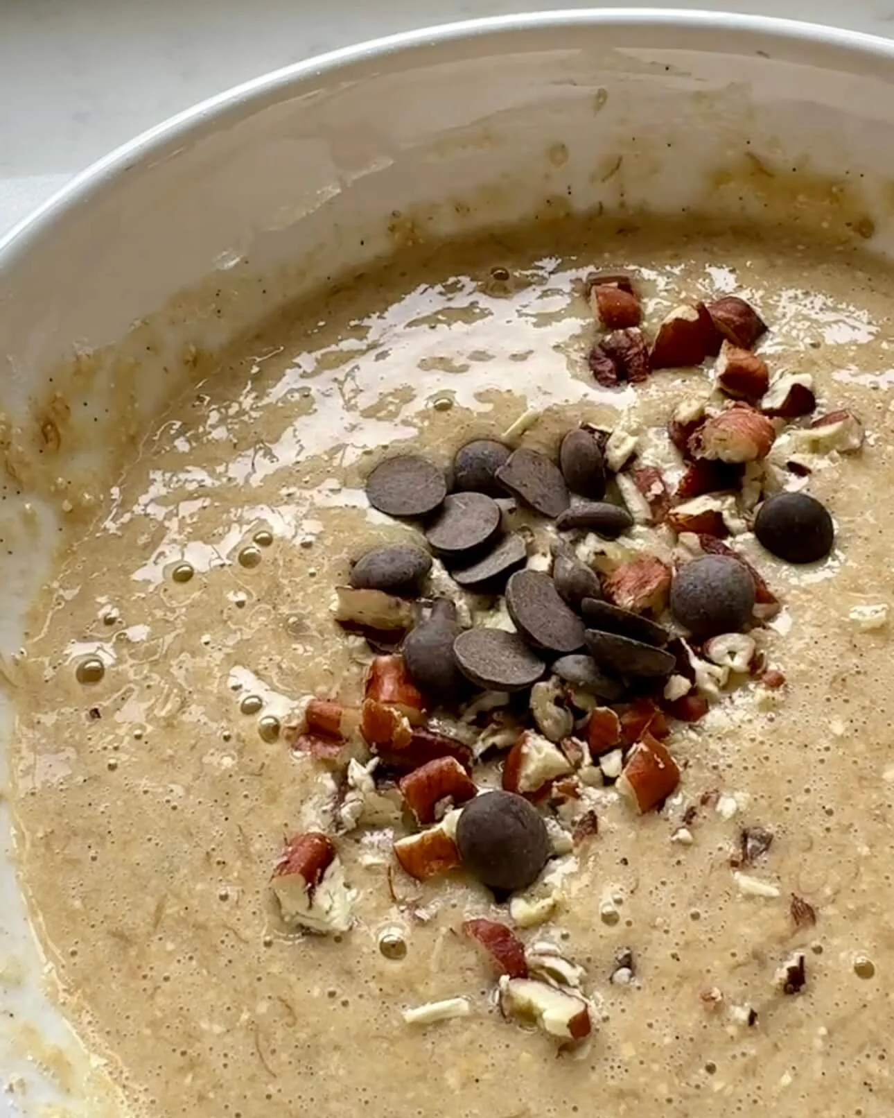 Add the Dry Ingredients Stir in oat flour, baking powder, and a pinch of salt until just combined. Fold in chocolate chips and walnuts if using. Coach tip: Avoid overmixing—this keeps the texture soft and bread-like instead of dense.