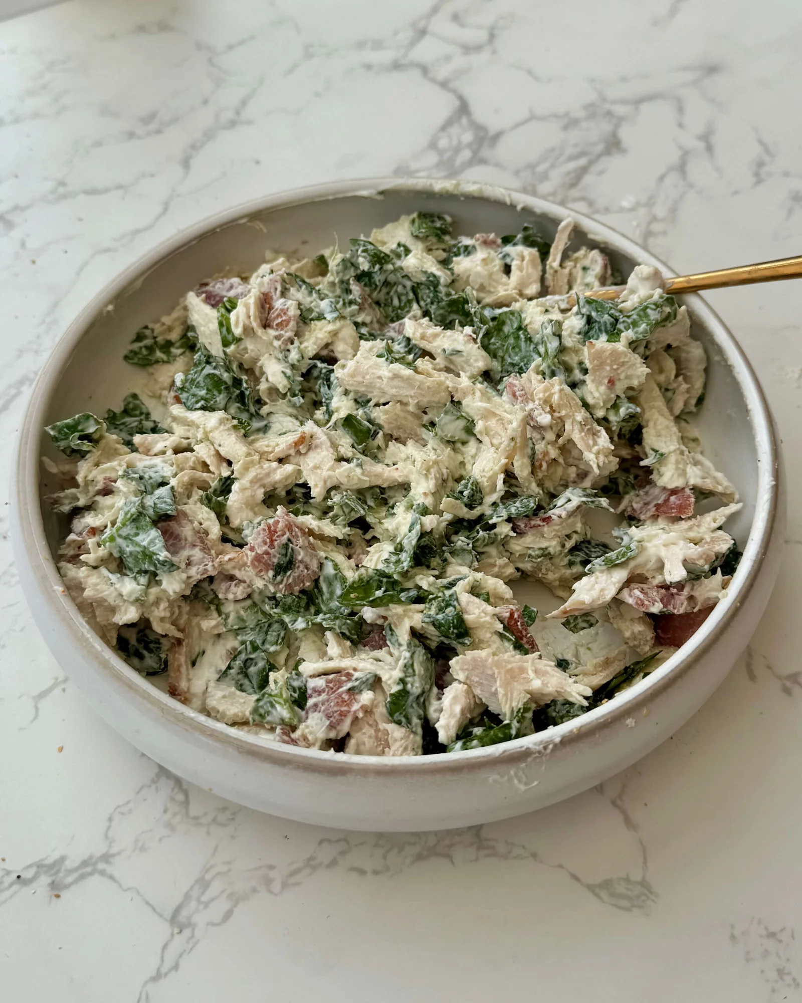 In a medium bowl, combine cream cheese, turkey, bacon, spinach, garlic powder, salt, and peppeCoach Tip: If your cream cheese feels stiff, let it rest at room temp for 10 minutes before mixing — it’ll be much easier to spread.