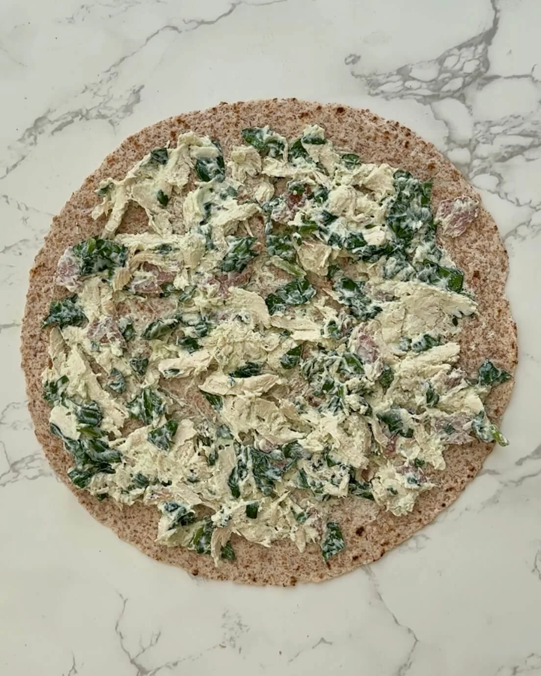 Lay one tortilla flat and evenly spread your turkey-cream cheese mixture across the surface.