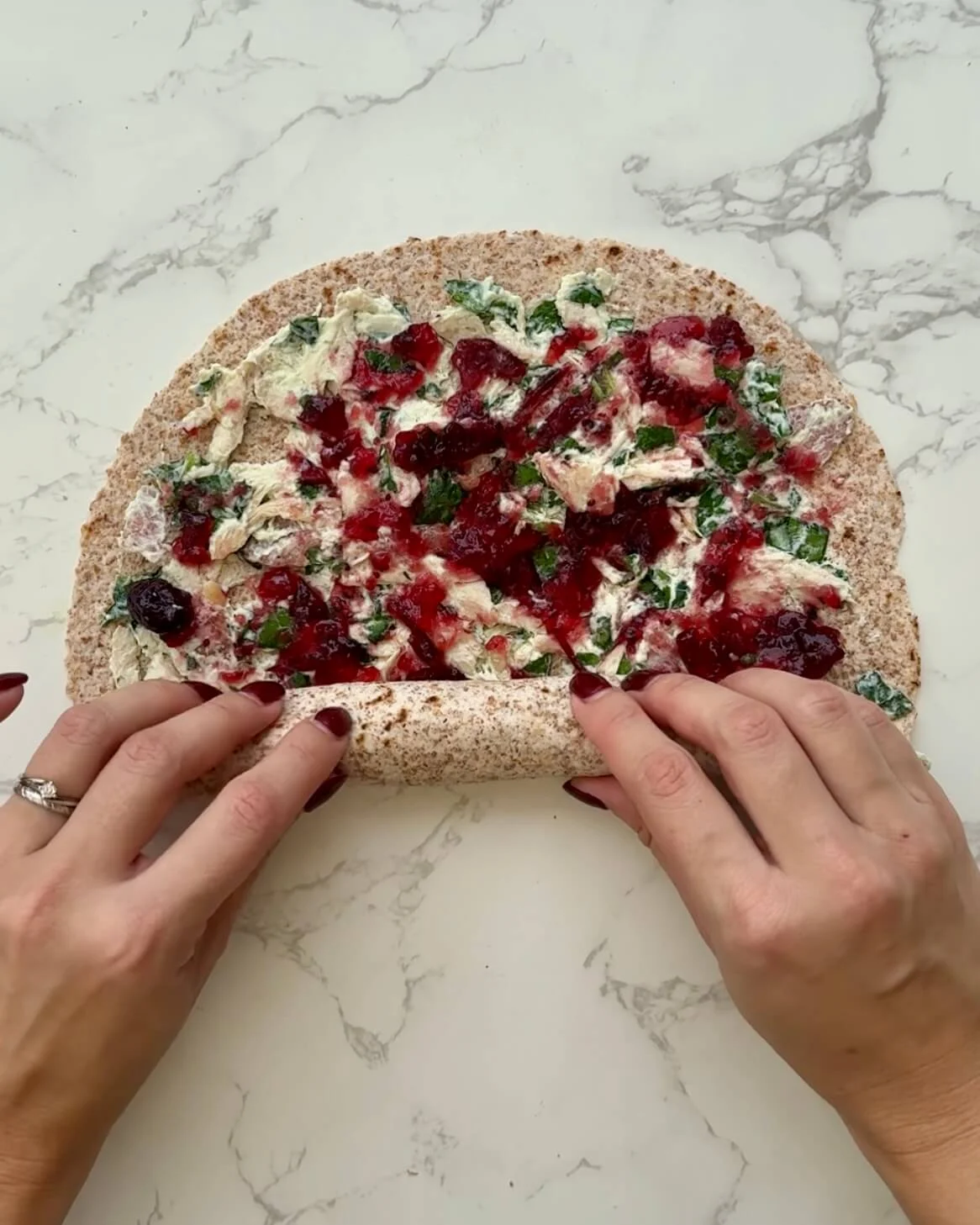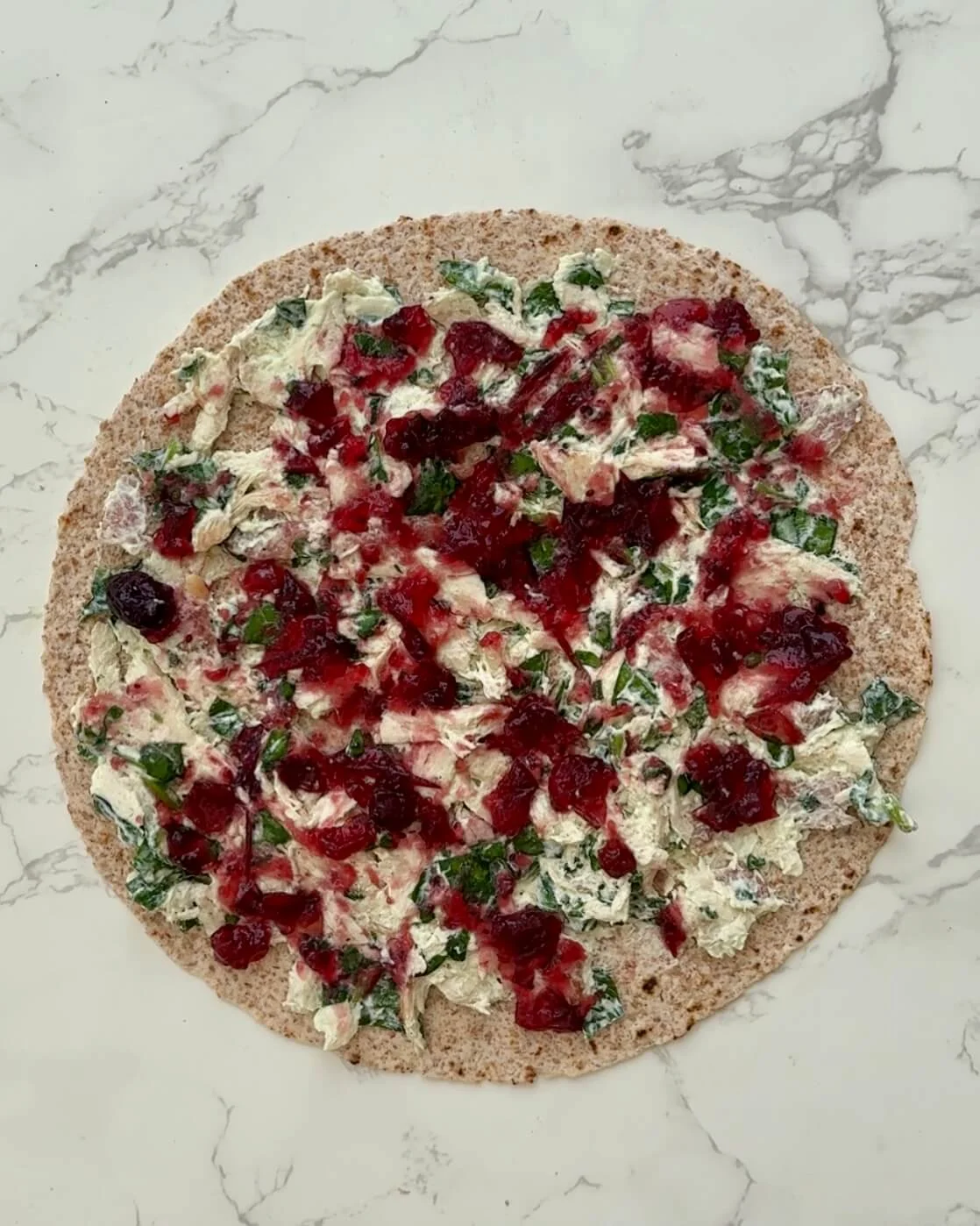Coach Tip: If your cranberry sauce is chunky, mash it slightly with a fork for smoother spreading. - Roll it up tightly