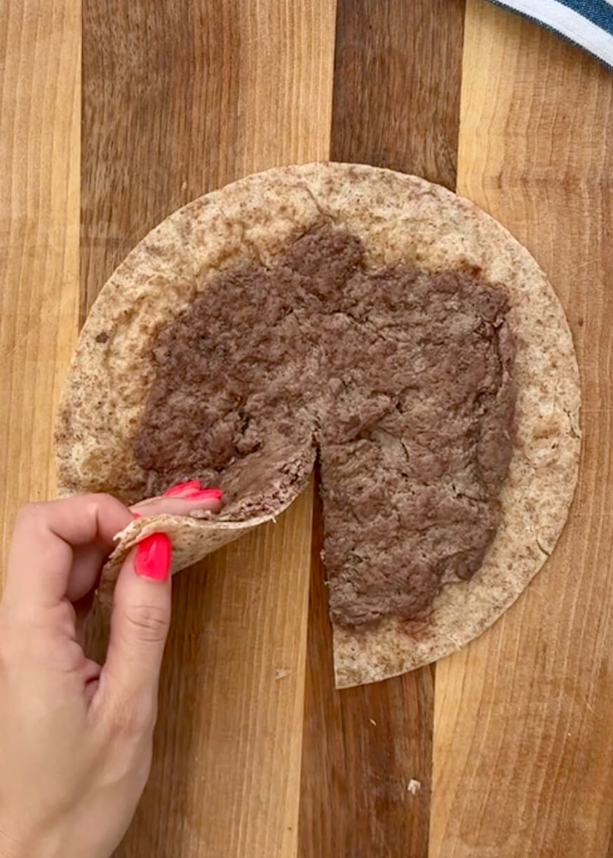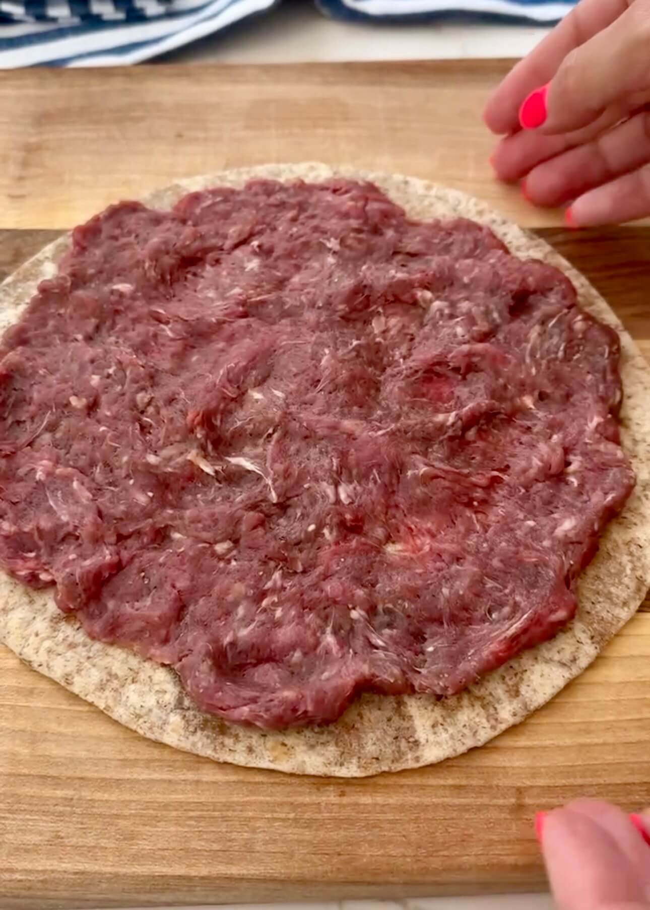 - Assemble the Wraps for Cooking: Place one wrap on a flat surface. Press one beef ball firmly into the centre of the wrap until flattened into a thin patty.