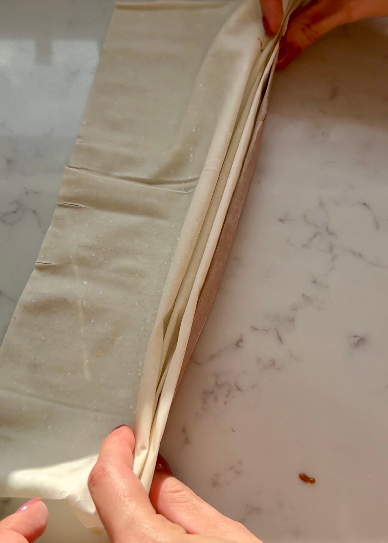 Lay one sheet of phyllo pastry flat. Spread a thin line of Biscoff spread along the long edge. Fold the pastry over by about 2 cm, then repeat folding until you form a long, thin strip.