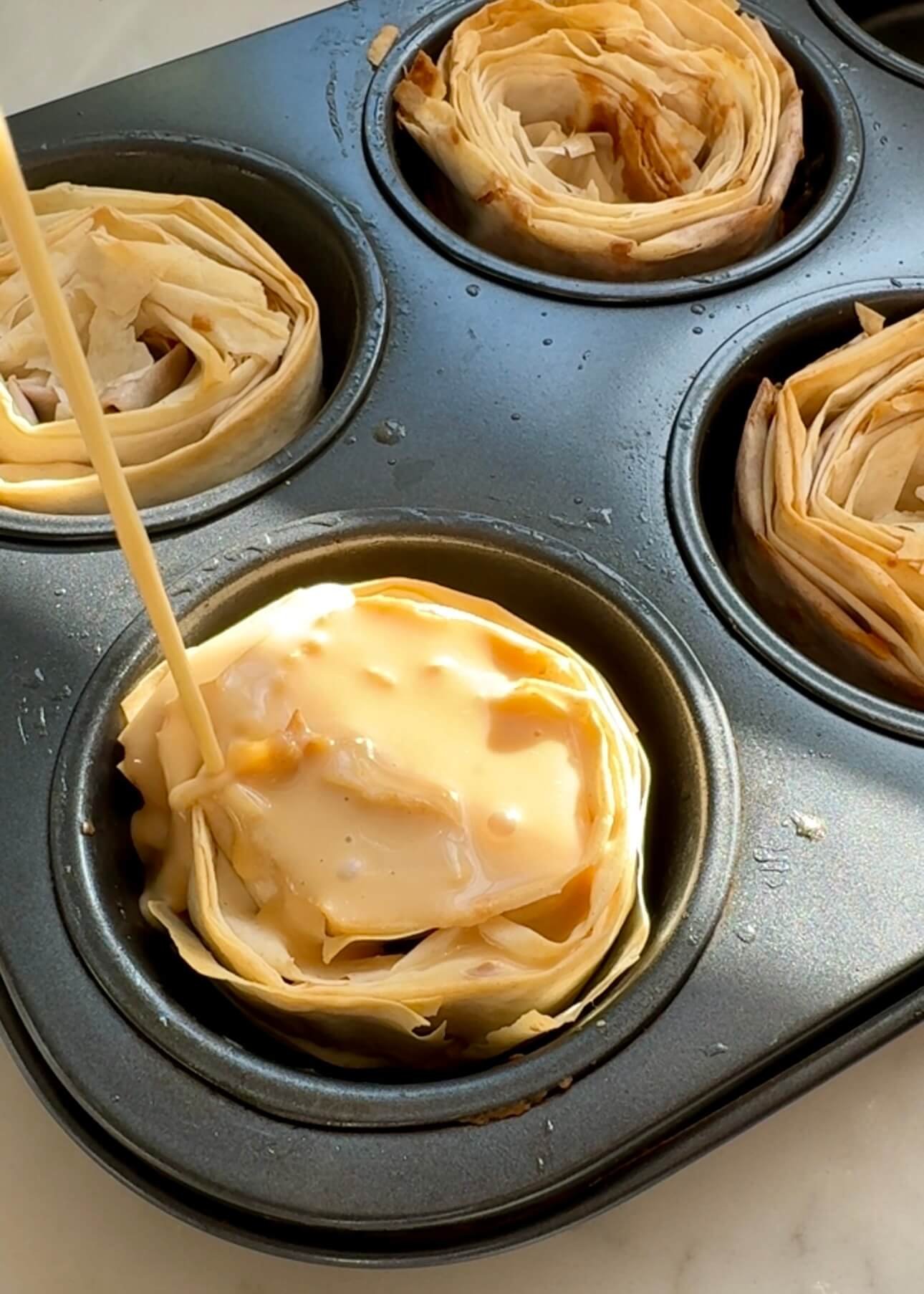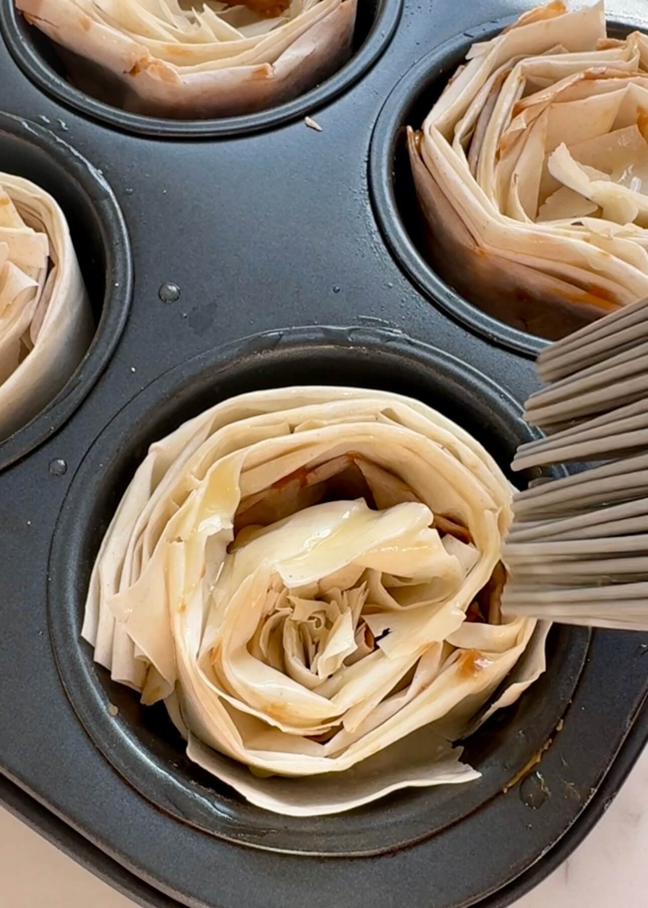 Loosely coil each strip and place it into a muffin tray cavity. Brush generously with melted butter, making sure to coat as many folds as possible.