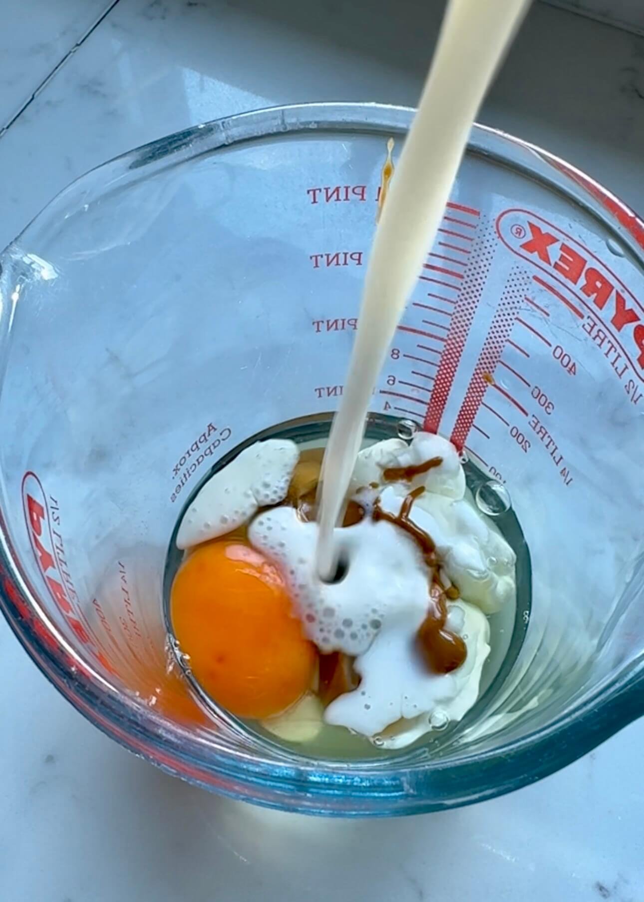 Whisk together the egg, yoghurt, melted Biscoff, and milk until smooth.