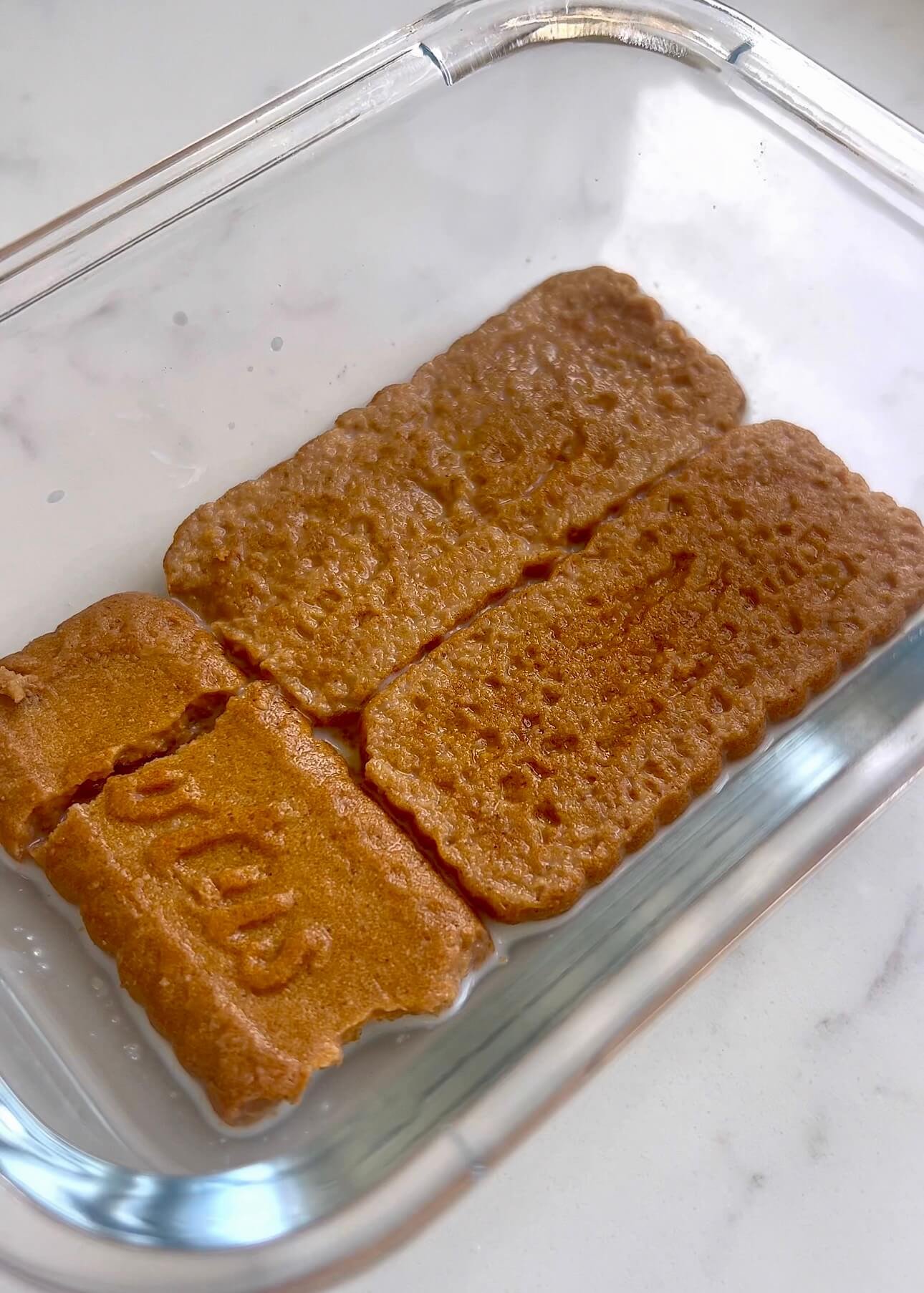 Briefly soak the Biscoff biscuits in milk, then layer them in the bottom of a ramekin.