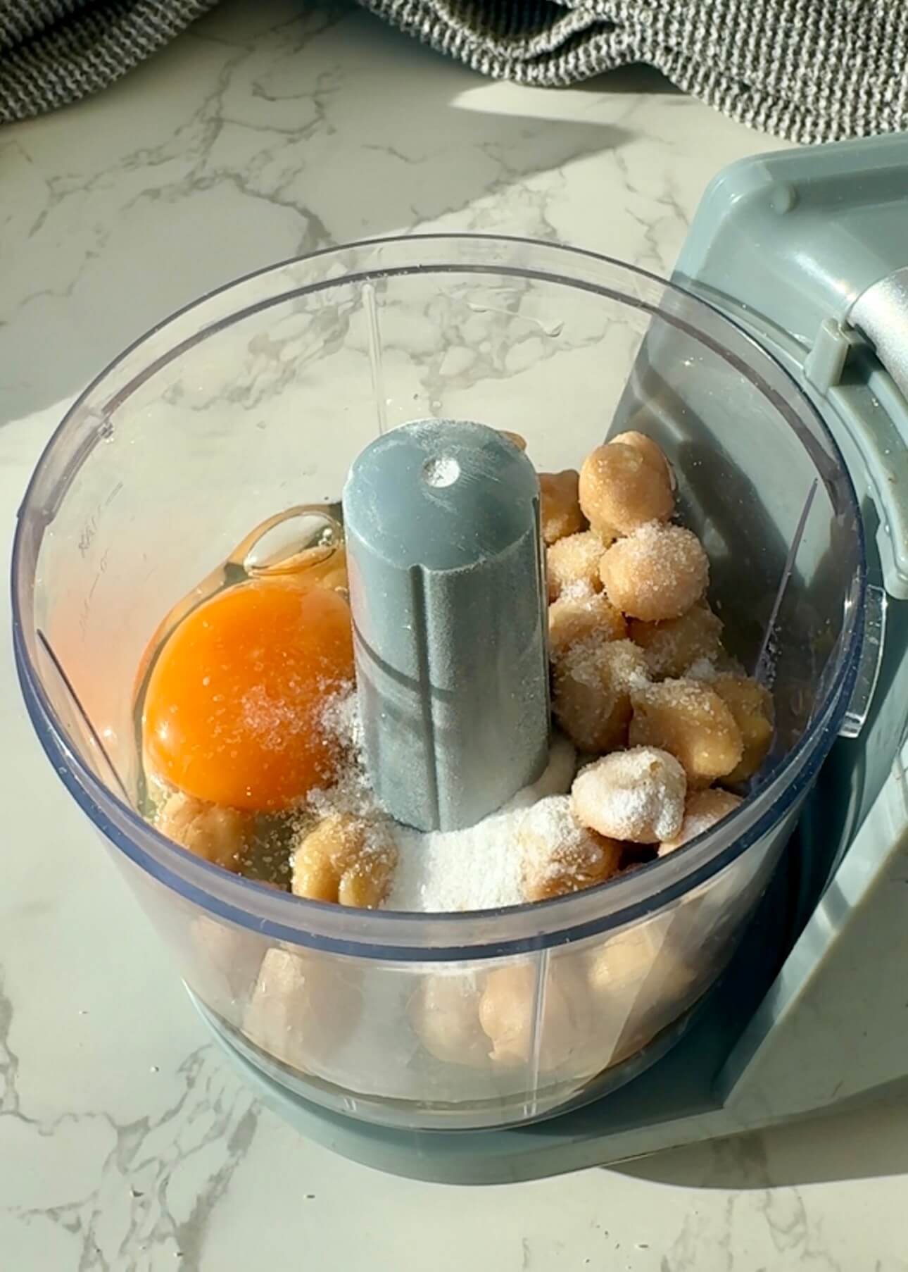 Add chickpeas, egg, olive oil, baking powder, and salt to a blender or bowl. Blend until completely smooth. Coach tip: Blend thoroughly to avoid a grainy texture. A smooth batter gives you a softer crumb and better rise.