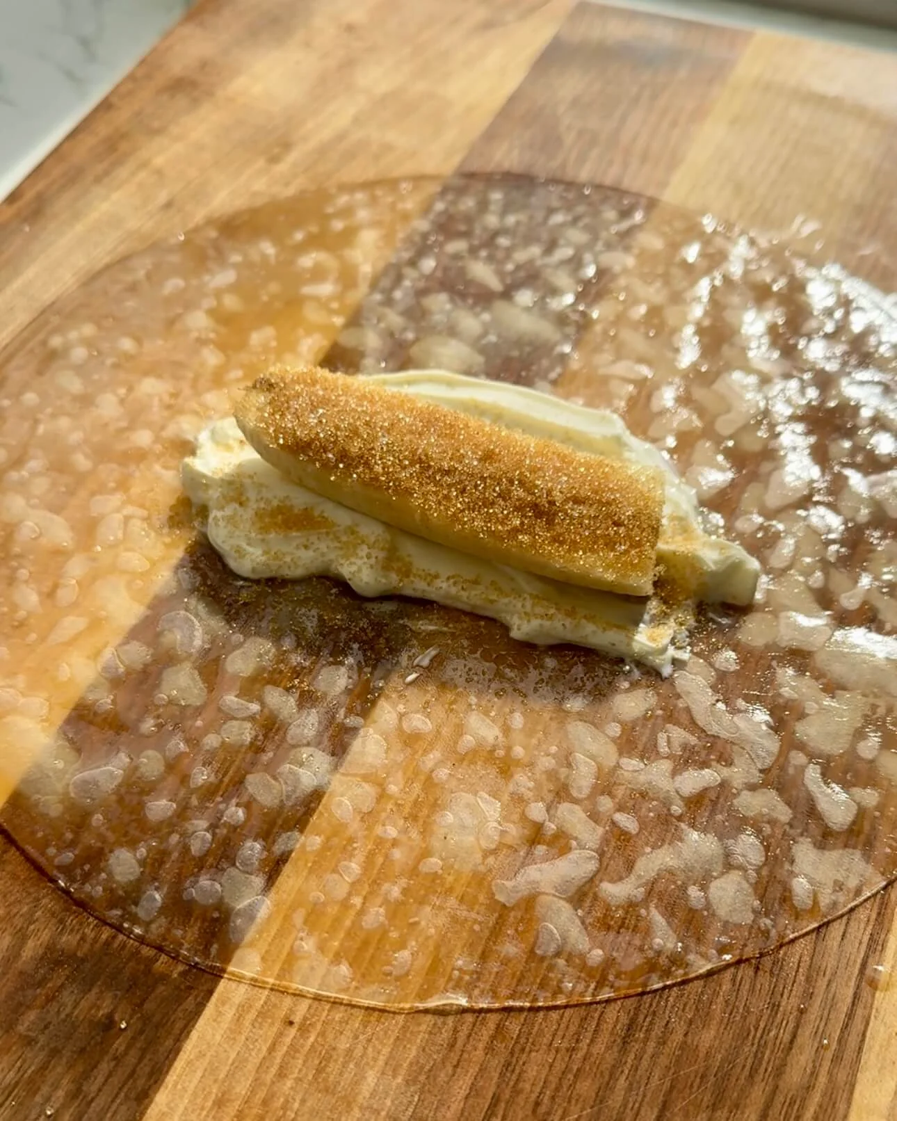 Spread 1 tablespoon of cream cheese in the center of the rice paper. Place a slice or two of banana on top, then sprinkle with 1 teaspoon of brown erythritol or sugar.