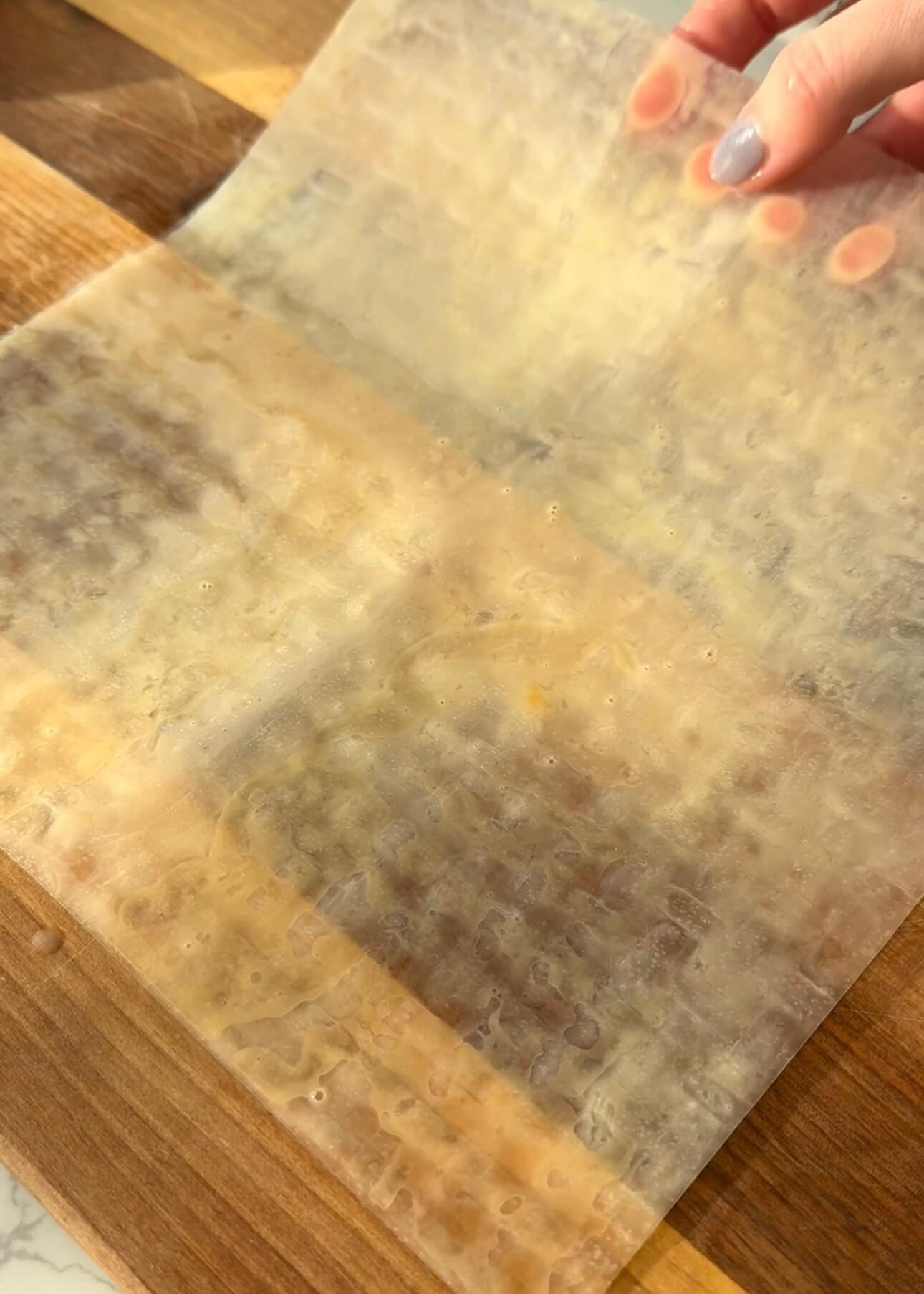 Dip one sheet at a time into the egg mixture for a few seconds until pliable. Lay it flat on a clean surface. Repeat and stack a second sheet on top (2 per roll).