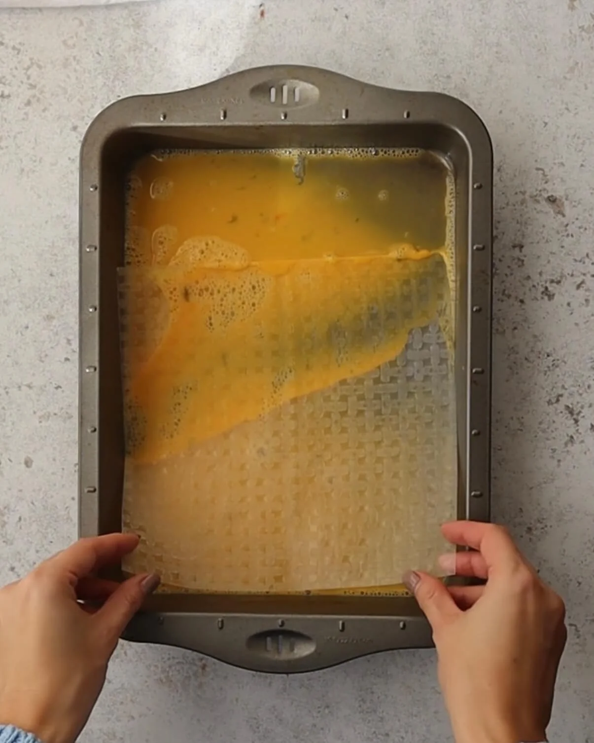 Soften & Coat the Rice Paper Dip each rice paper sheet into the egg mixture until just softened. Coach tip: Don’t oversoak. Soft but still structured leads to a crispier finish.