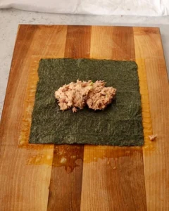 Layer & Fill Place the coated rice paper on a flat surface, lay a nori sheet on top, then add one-quarter of the tuna mixture. Fold the sides inward and roll tightly. Coach tip: Tighter rolls = better texture and fewer air pockets.