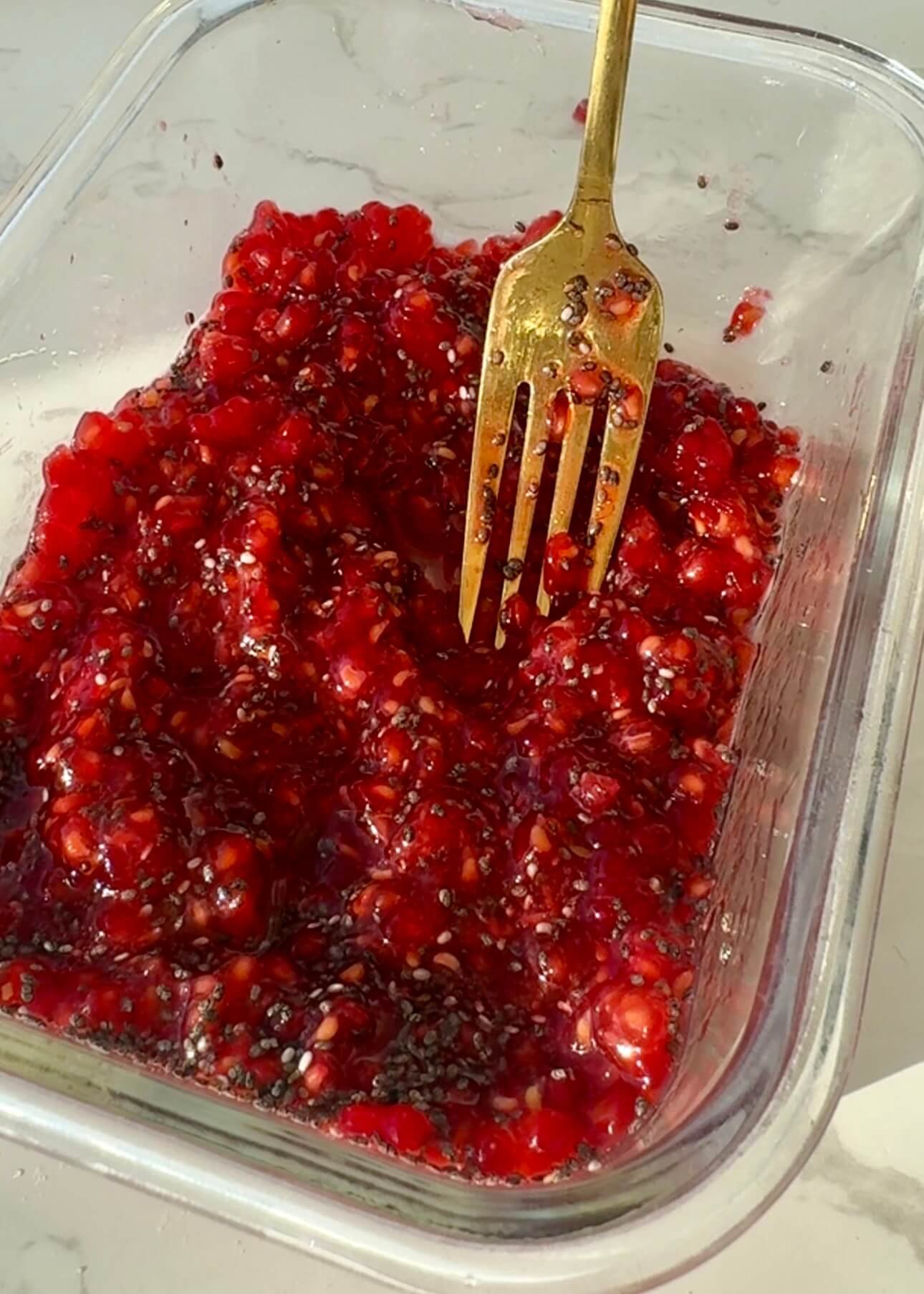 - Mash raspberries in a bowl. Stir in chia seeds and optional agave.