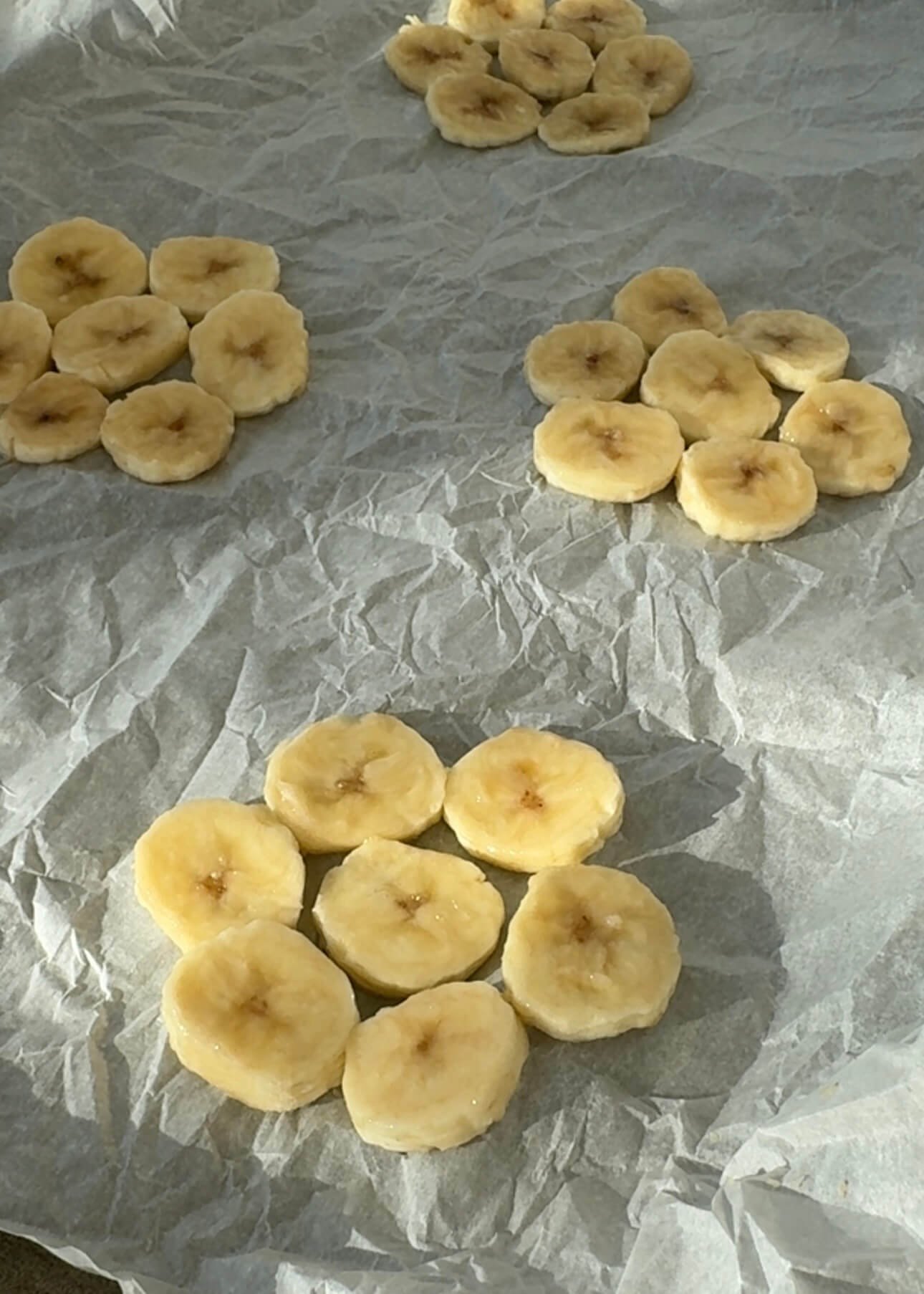 - Arrange 6–7 banana slices in a flower shape on parchment paper.