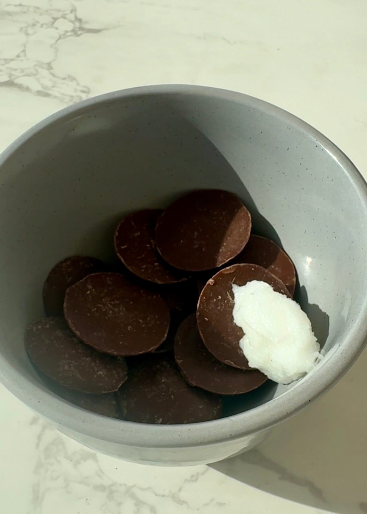 - Melt dark chocolate with coconut oil until smooth.