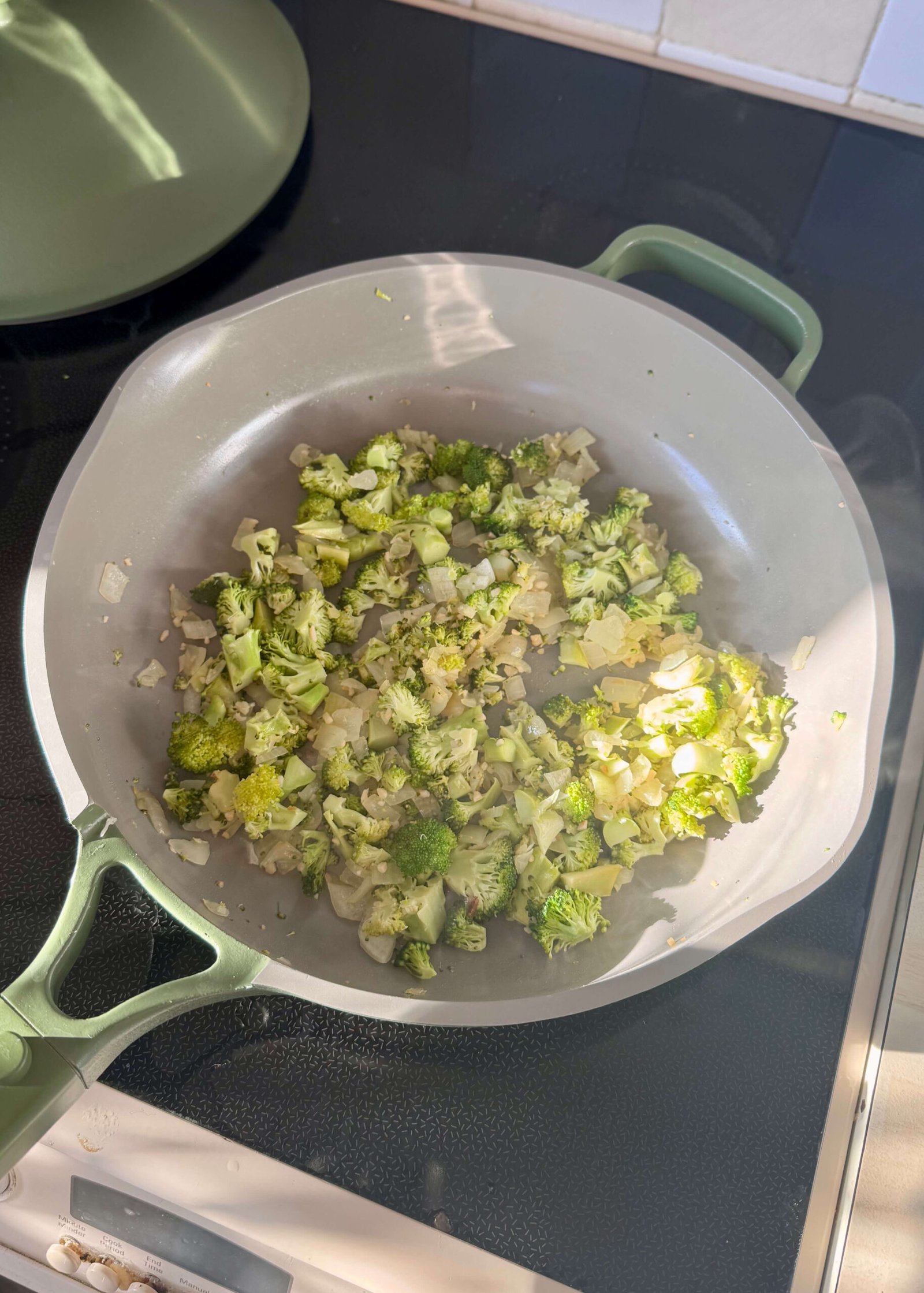 Heat avocado oil in a skillet over medium heat. Add onion, garlic, and broccoli. Cook for 4–6 minutes until softened. Remove from heat and let cool slightly.