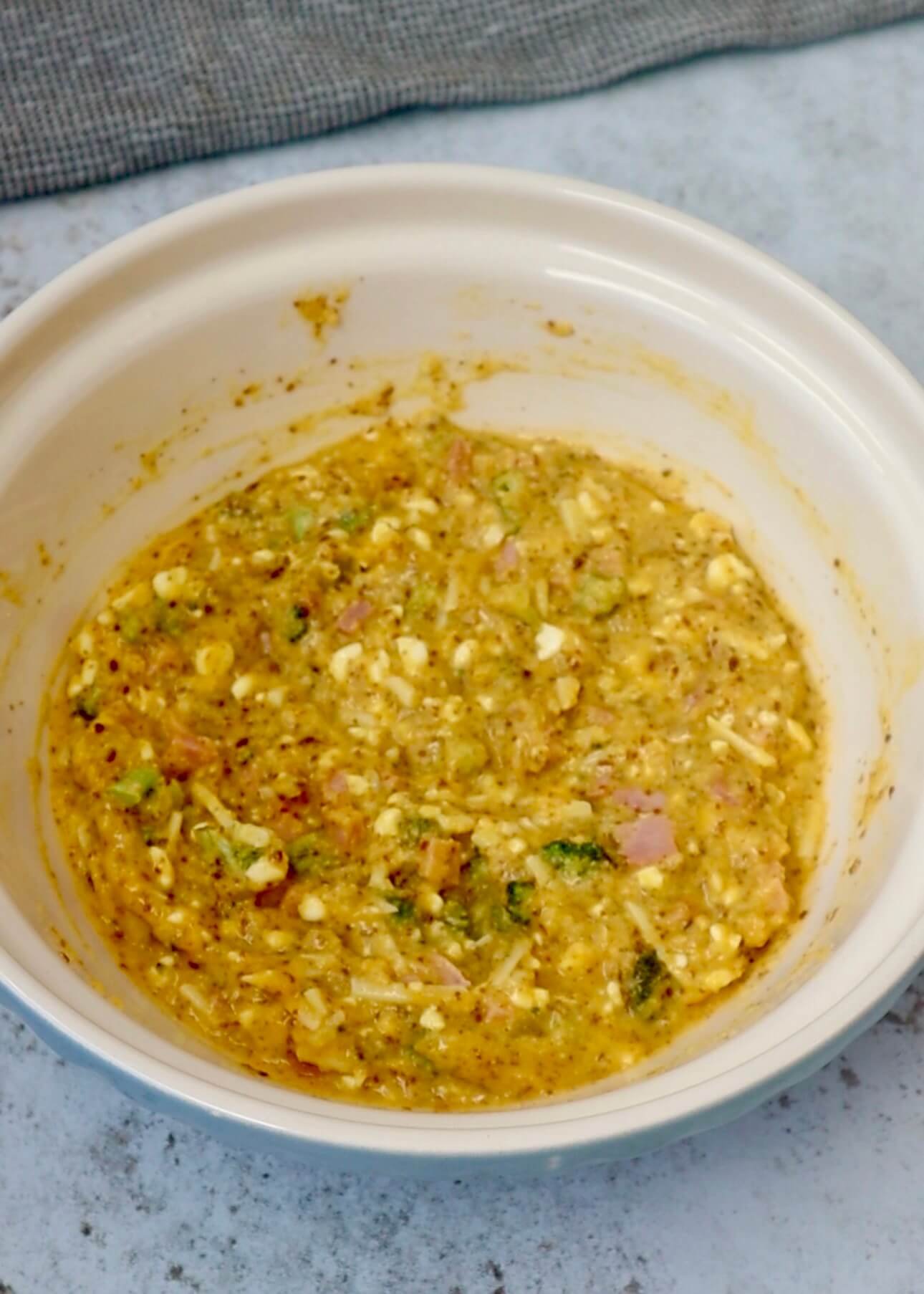 Gently fold in the cooled veggie mixture, diced ham, and ½ cup cheddar cheese. Let the batter rest for 5 minutes to thicken.