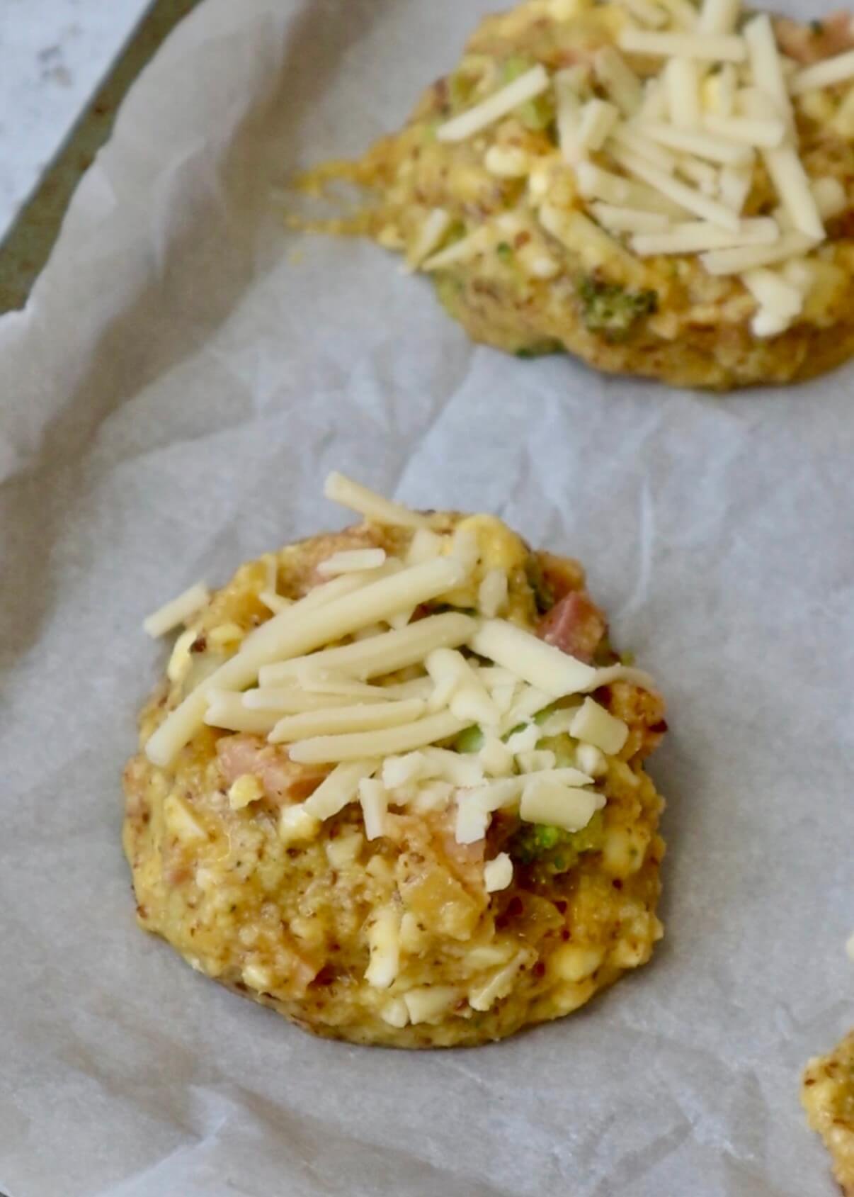 Scoop 2–3 tablespoon mounds onto the baking sheet, spacing them evenly. Sprinkle the tops with remaining cheddar.