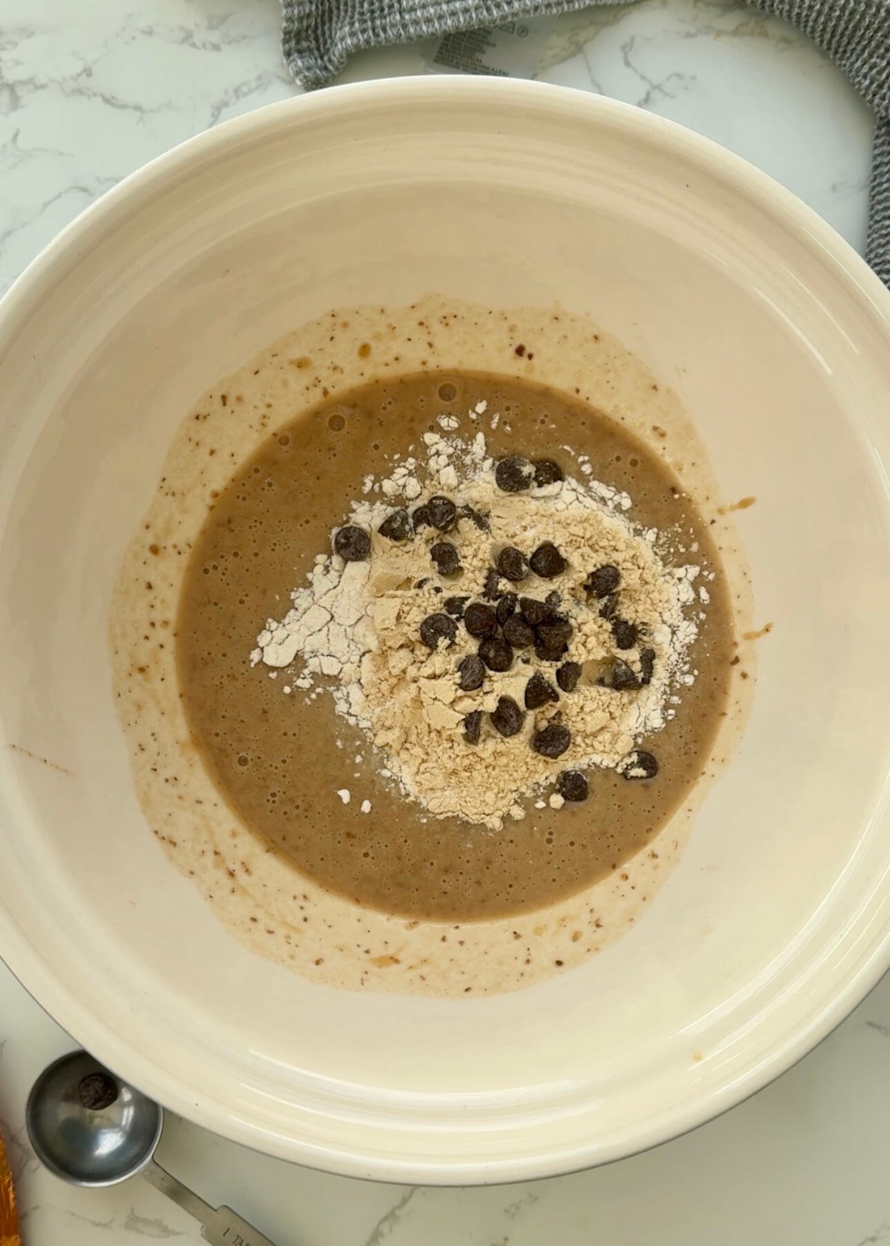 Transfer the mixture to a bowl. Gently fold in the flour, protein powder, chopped peanuts, chocolate chips, and salt.