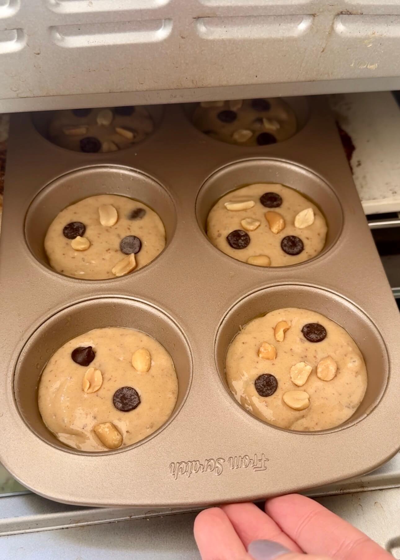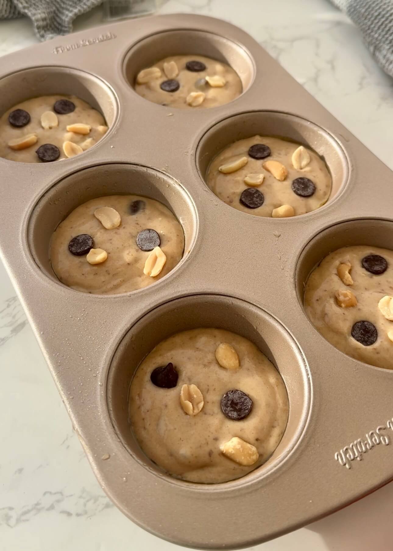 Divide the batter evenly between the 6 muffin cups. Top with extra peanuts or chocolate chips if desired.