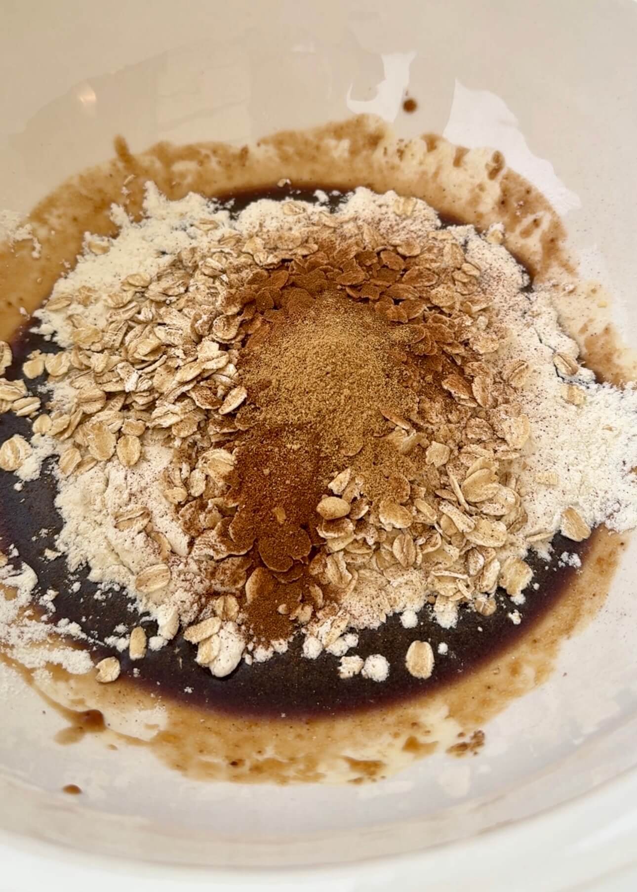 Stir in flour, protein powder (if using), oats, spices, and salt until combined.