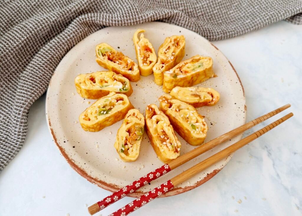 Tamagoyaki, a Japanese rolled omelette, is traditionally made with a lightly sweetened egg mixture cooked in thin layers. This version adds kimchi for a punch of flavour, spring onions for freshness, and cheese for extra richness. It’s an easy yet impressive dish that can be enjoyed on its own, with rice, or as part of a larger meal.