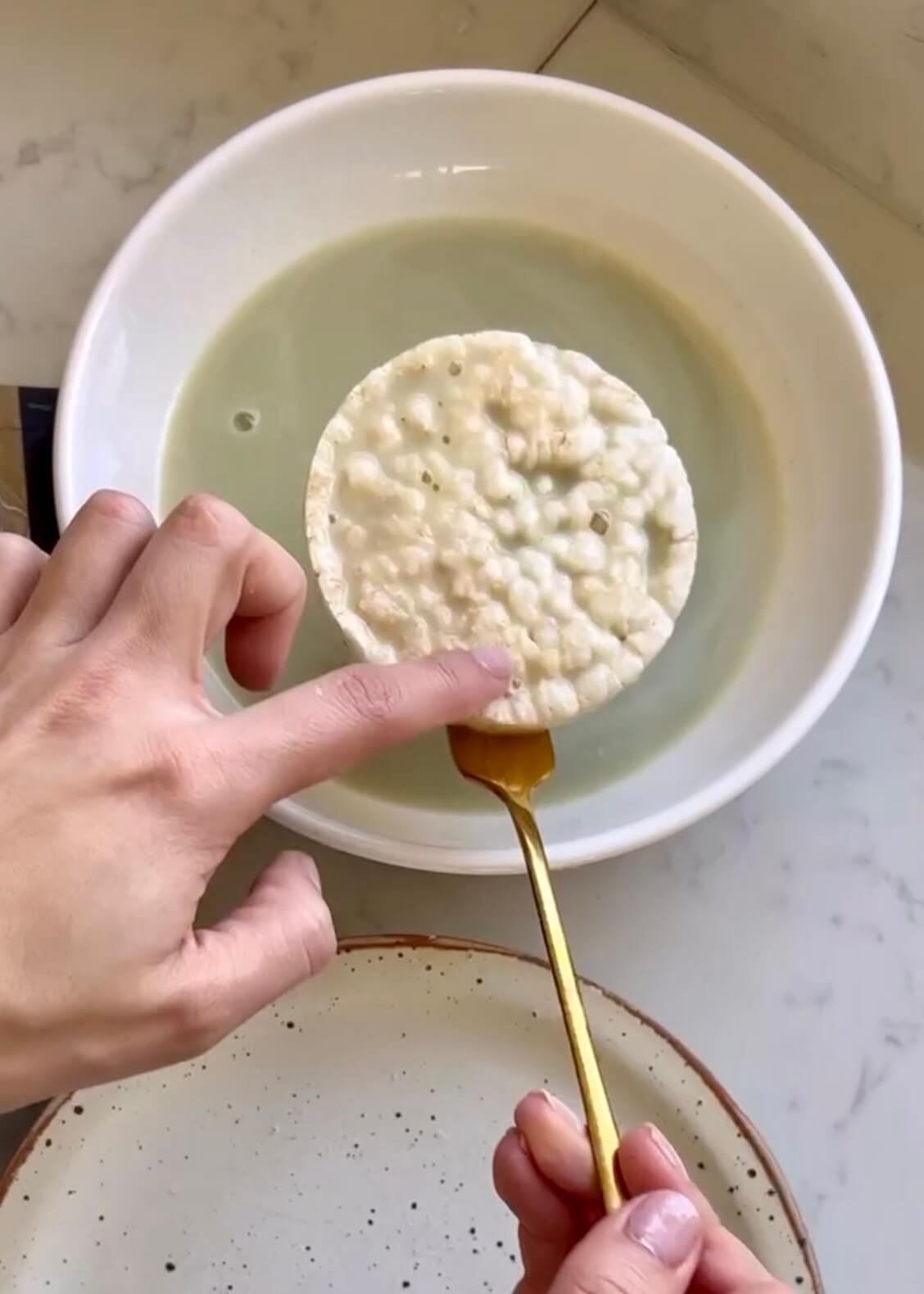 Mix the protein matcha latte powder with water until you get a coffee-like consistency. Pour into a shallow bowl. Coach tip: Don’t make it too watery or the rice cakes will fall apart.