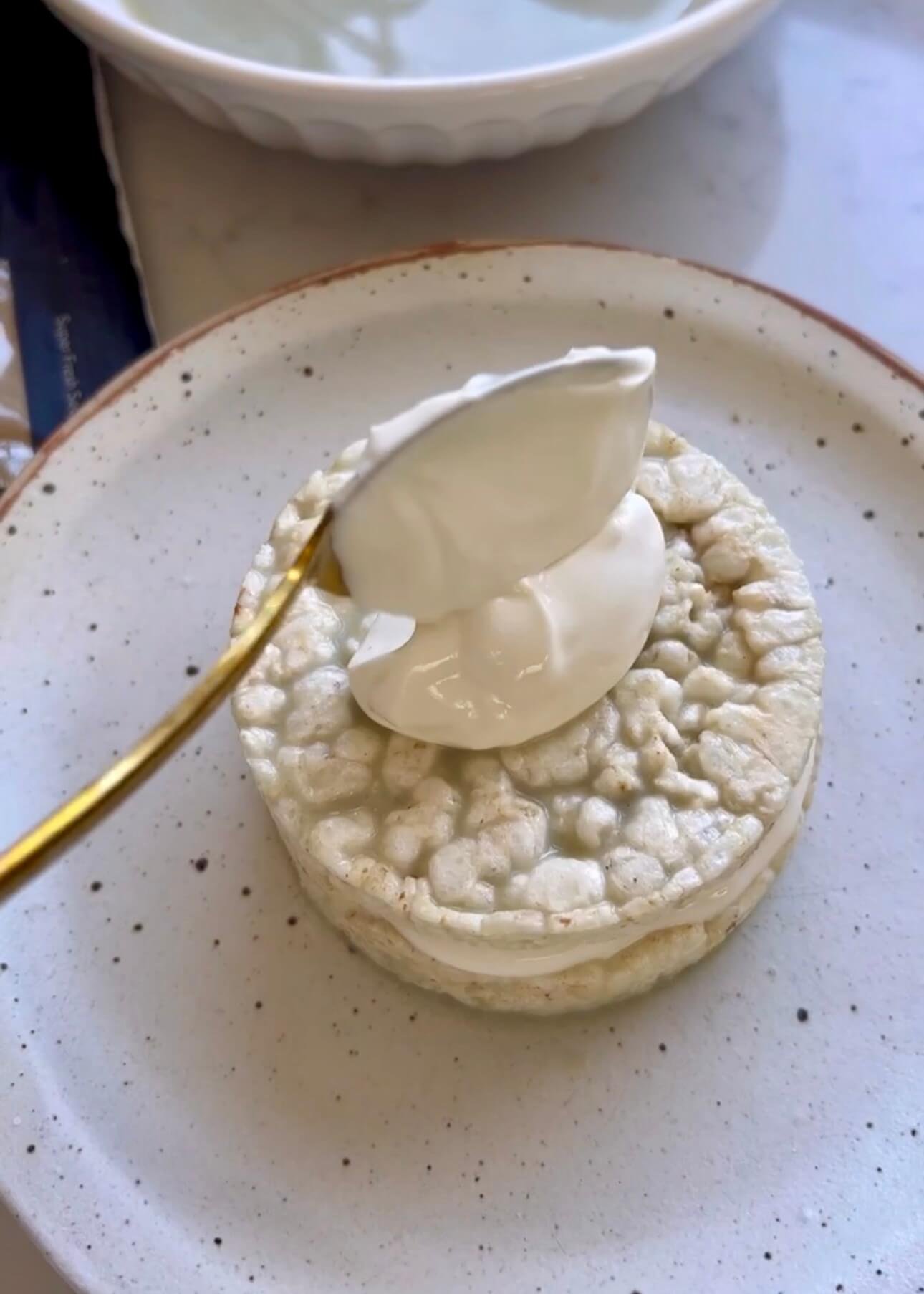Rice cakes themselves are low in protein (about 1–2g each), but this recipe becomes high-protein thanks to the yoghurt, cream cheese and protein powder.