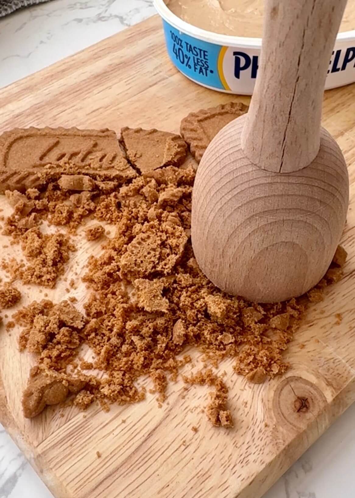 Crush the biscuits until fine with no big lumps. Sprinkle most of them over the cheesecake layer. Coach tip: This acts like a biscoff cheesecake crust, just flipped for speed and less washing up.
