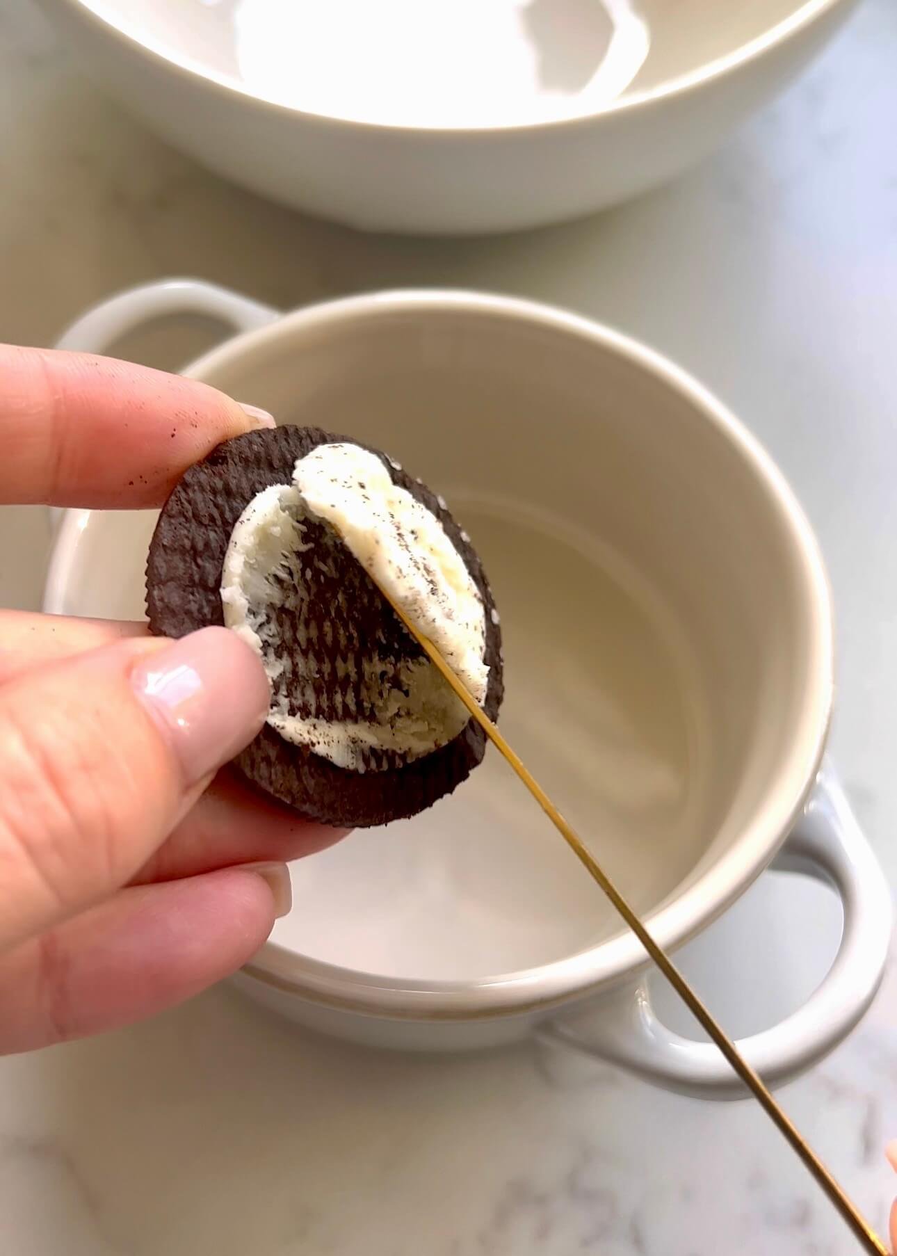 Briefly dip the Oreo biscuits into milk and place them in the bottom of a ramekin. Coach tip: A quick dip is enough to soften them while maintaining texture.