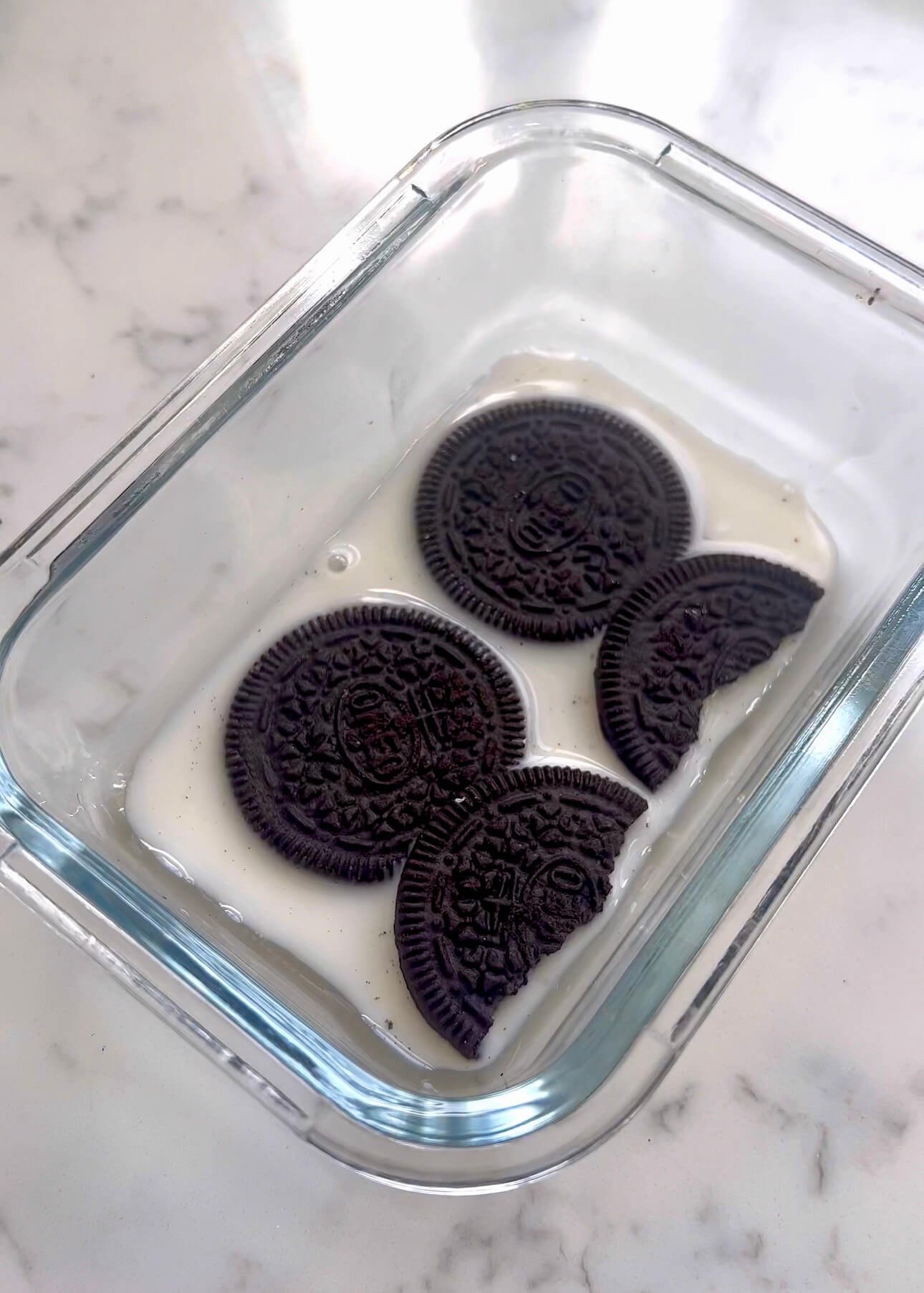 Briefly dip the Oreo biscuits into milk and place them in the bottom of a ramekin.