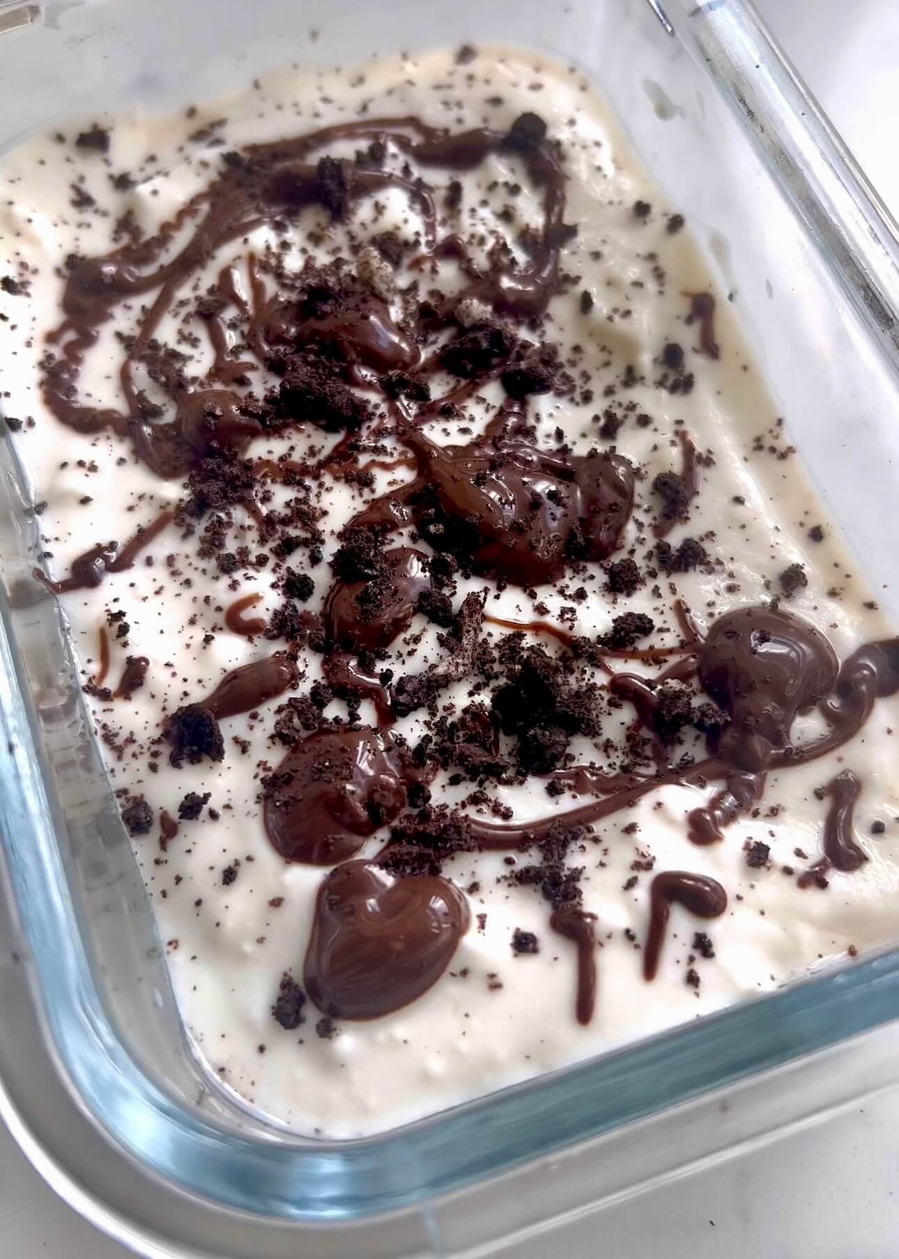 Top with melted chocolate spread and crushed Oreo biscuits.