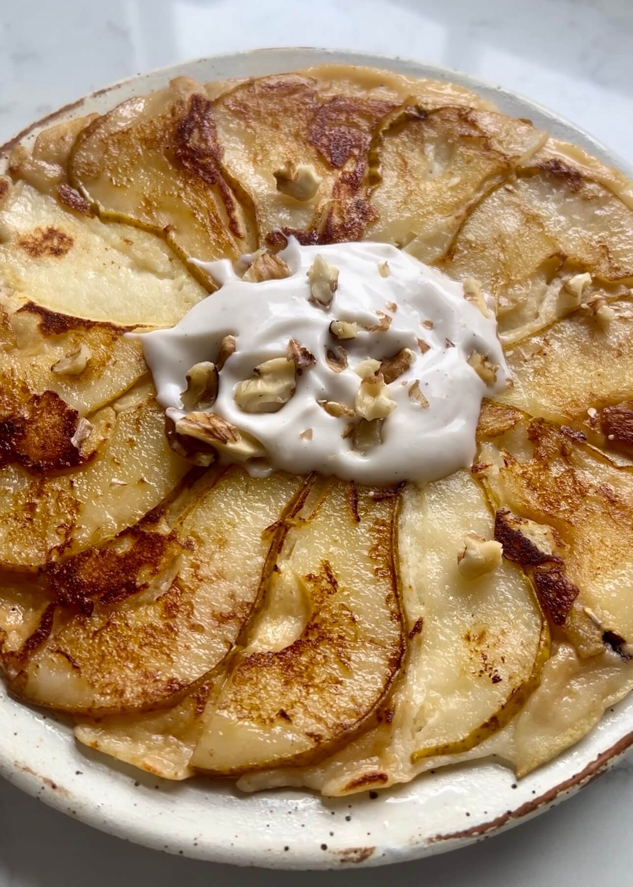 - 1 pears (sliced thinly)– Naturally sweet and caramelises beautifully.