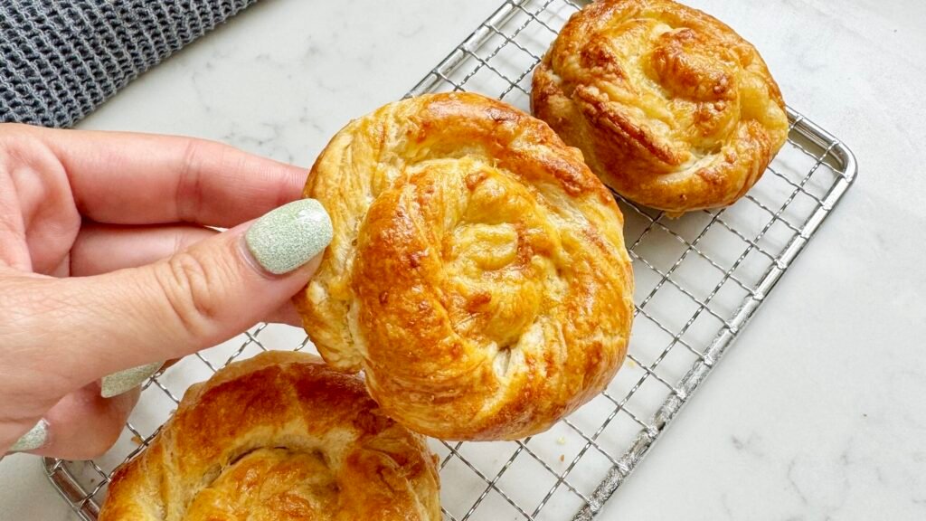 - Cut the roll in the middle and then do a simple braid, add to a baking tray and rest for 45 minutes