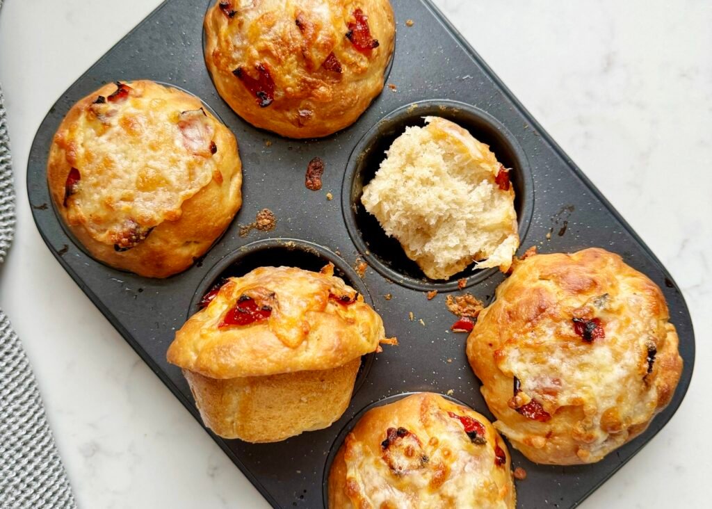 Grease a muffin tin and divide the dough into 6-8 portions, add the dough to the tin, cover and rest for 45 minutes