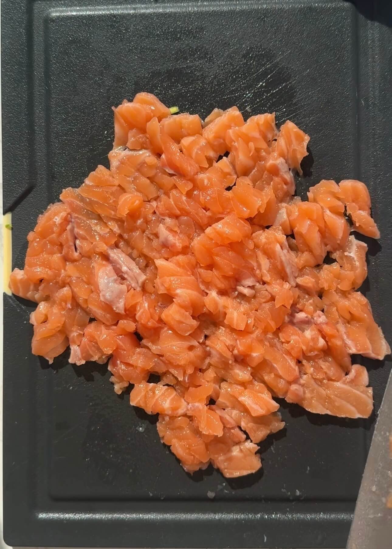 Finely chop the salmon until it reaches an almost ground consistency.