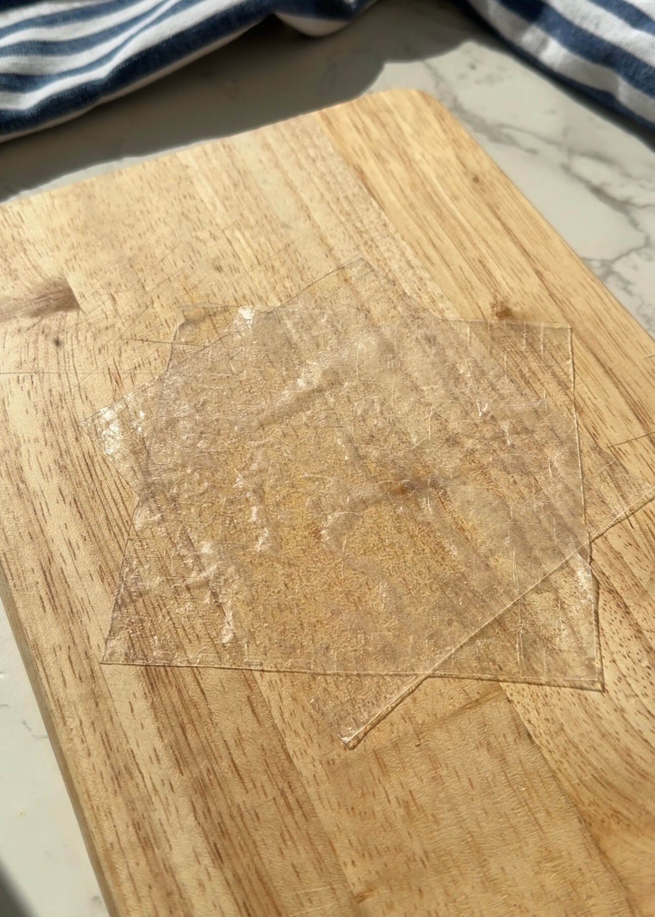 Cut each rice paper sheet into 4 equal pieces. Lightly hydrate 2 pieces and layer them together.