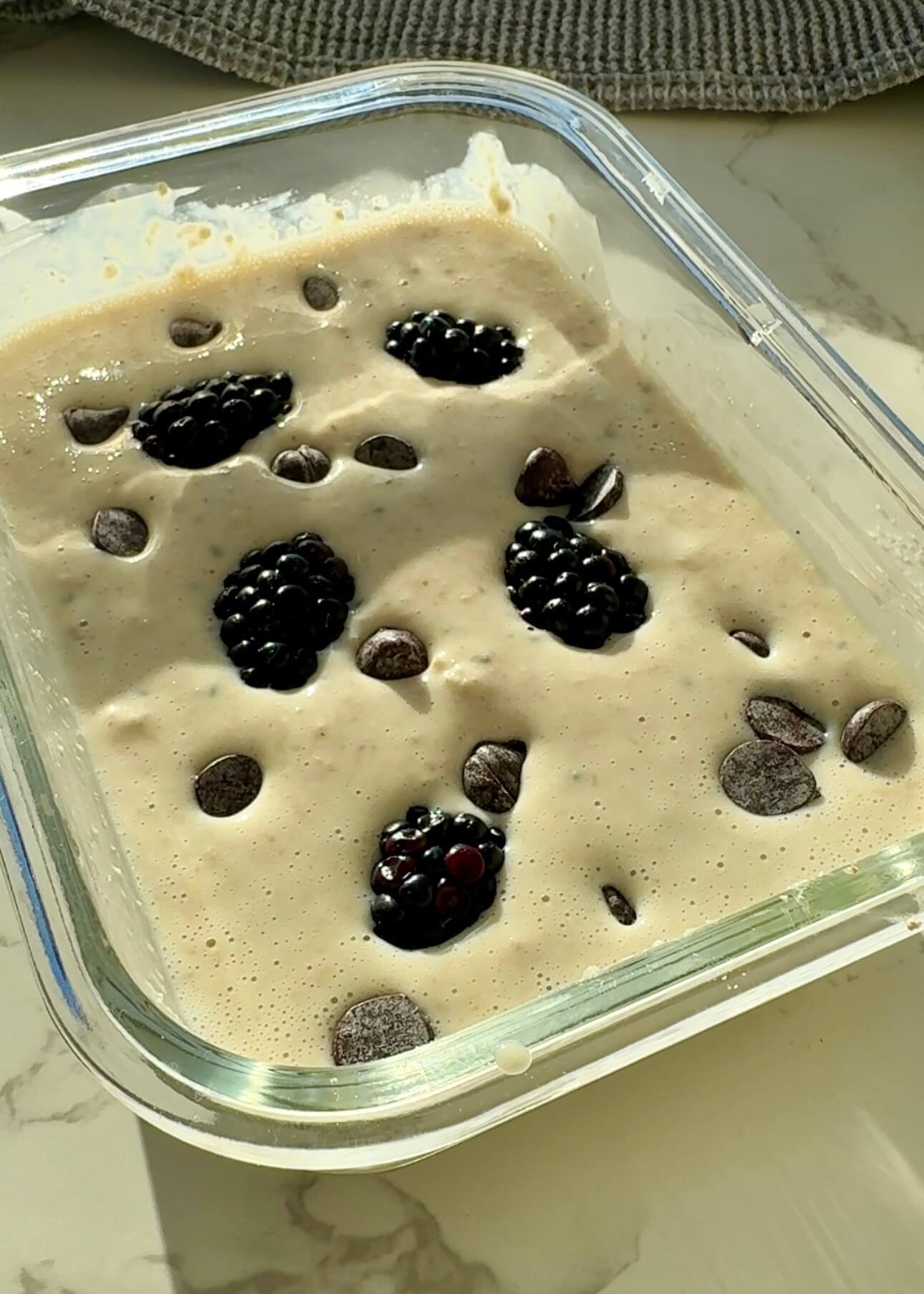 Coach tip: Folding rather than stirring helps prevent excess moisture release from the fruit. - Pour the batter into a lightly greased, oven- or air-fryer-safe ramekin.