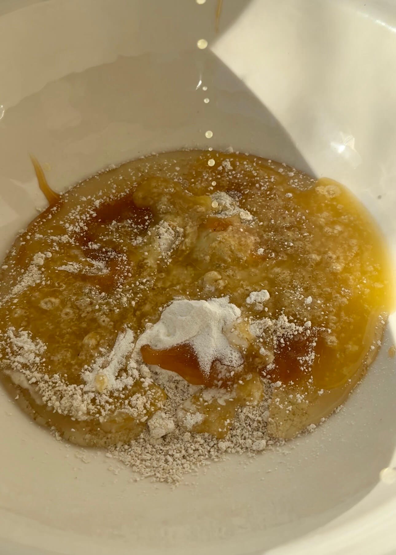 In a large bowl, combine the white bean paste, maple syrup, melted butter, and vanilla. Mix until completely smooth. Coach tip: The smoother your bean paste, the better your final texture. Proper blending removes any concern about desert beans flavour.