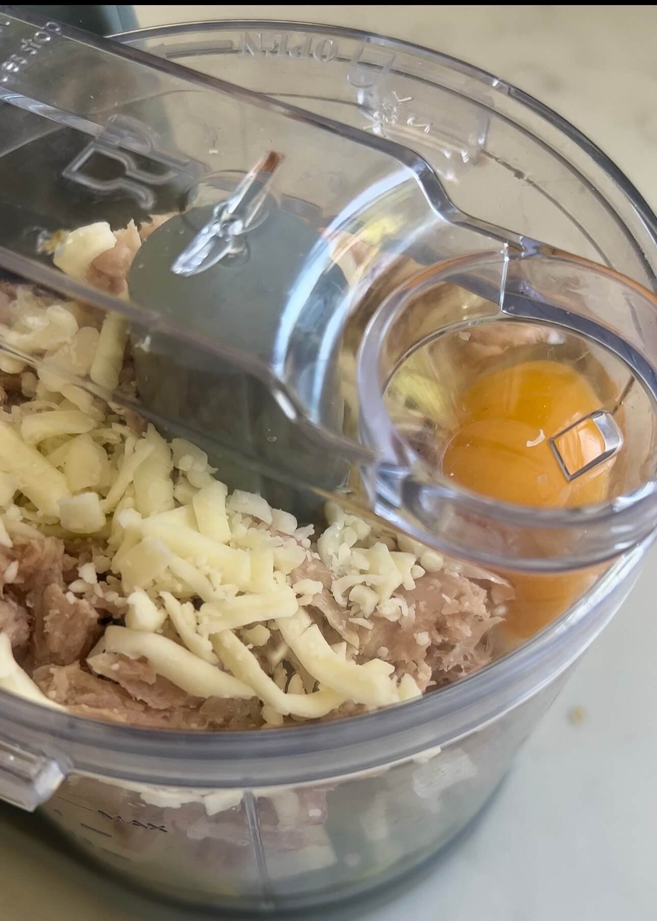 Add tuna, cucumber, onion, egg, and mozzarella to a food processor. Pulse until combined but not completely smooth.
